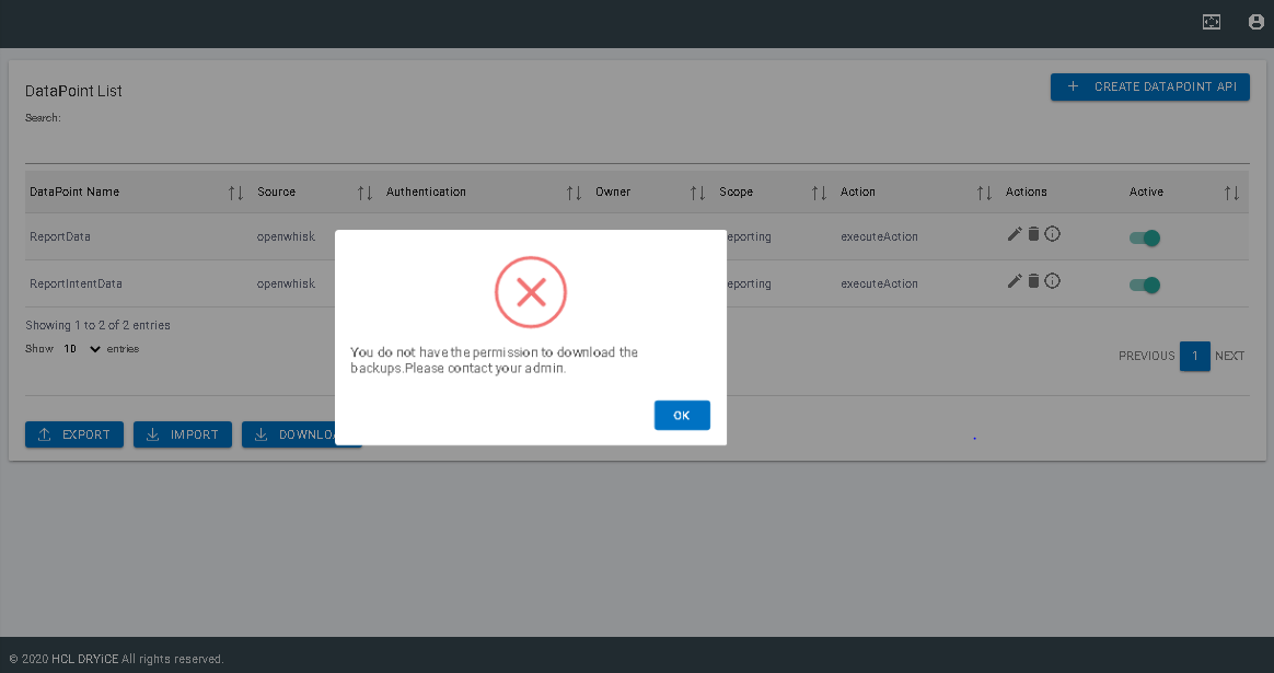 A user may download a backup from the lists of backups created and stored on cloud by clicking on the download button. In order to download, the user needs to have the permission to download the backup which is administered by the admin of the tenant. If the user does not have the access to download the backup, he/she gets the message as shown below: