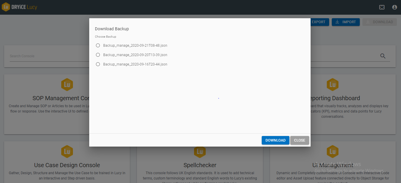 Once the download option is enabled from master configuration console, the user can find a list of the latest backups for the respective consoles on clicking upon the download button present on the mentioned consoles from where a file can be selected and downloaded as shown below: