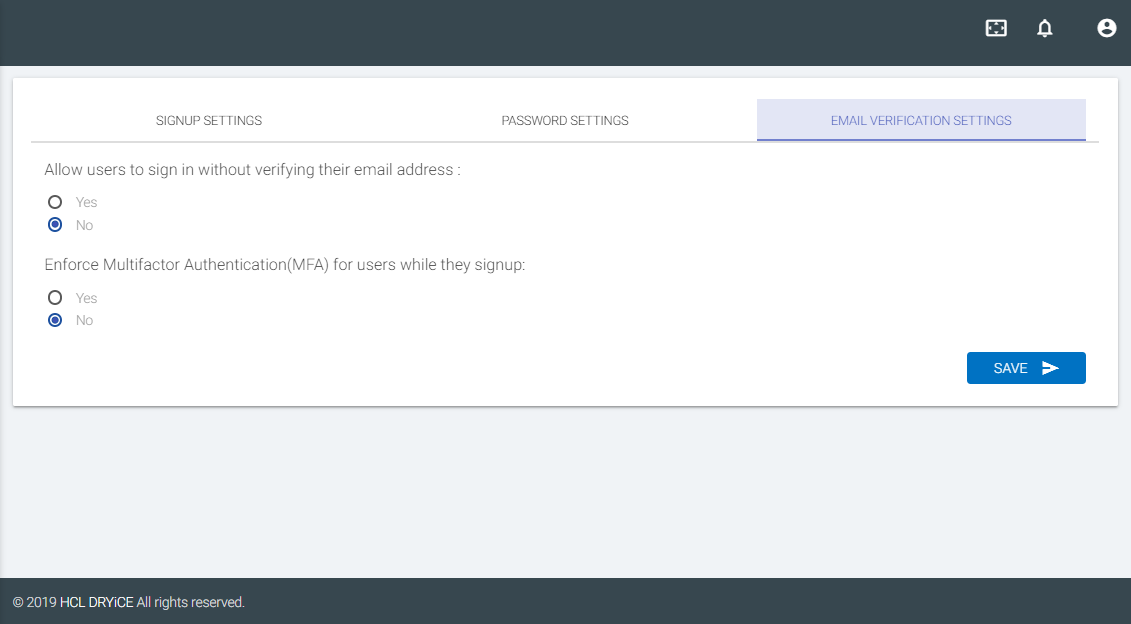 An admin can enable/disable email verification and Multi Factor Authentication (MFA) through this section.