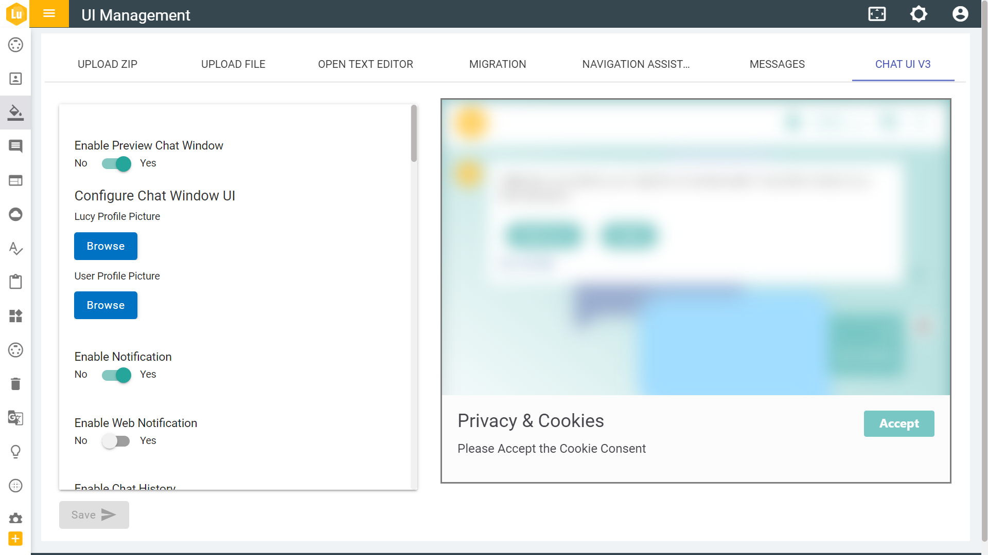 Enabling Preview Chat Window On the Chat UI V3 page, enable the toggle for “Enable Preview Chat Window”. On enabling it, two more sections get added to the page. Figure 1. Figure 104 - Chat UI V3 Enabled Preview Chat Window