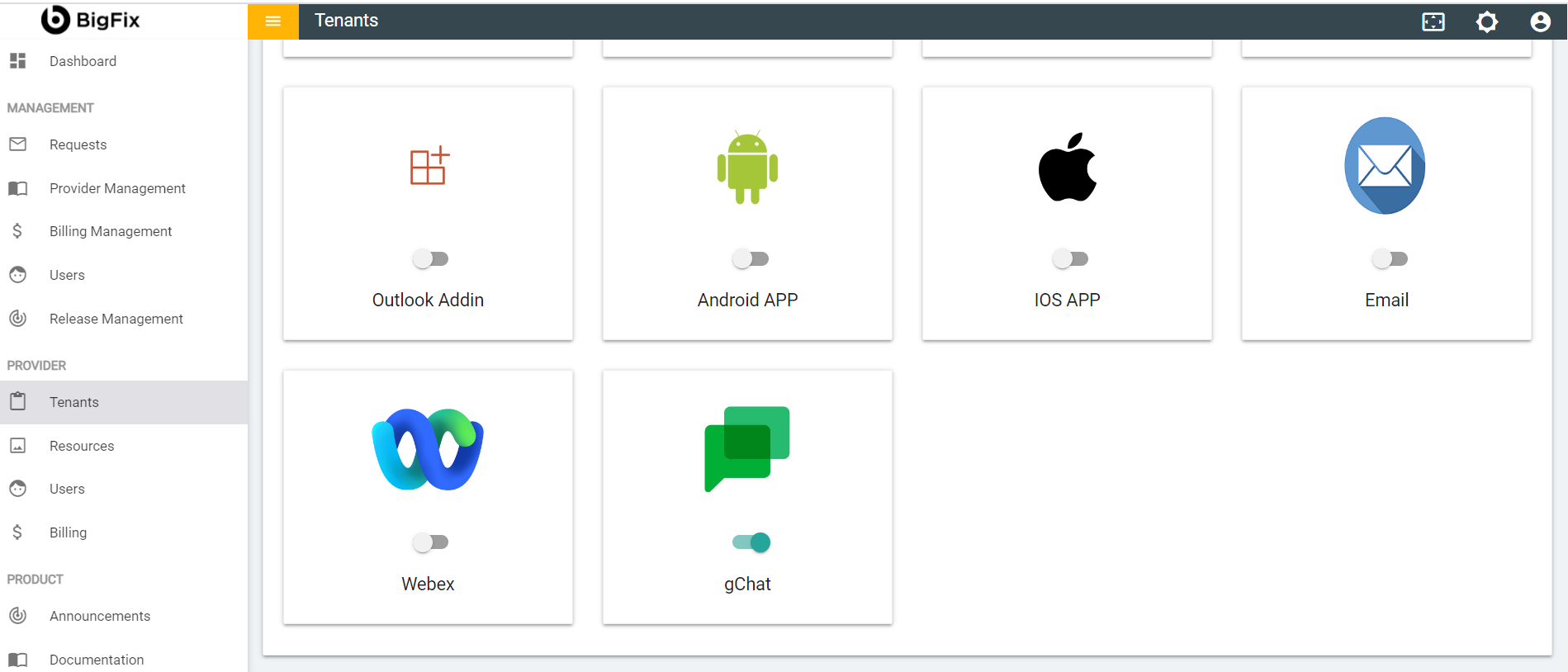 - To start using BigFix AEX over Google Chat, the user needs to access Global Admin Console and navigate to the tenants tab.