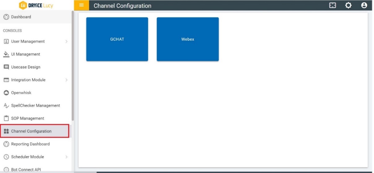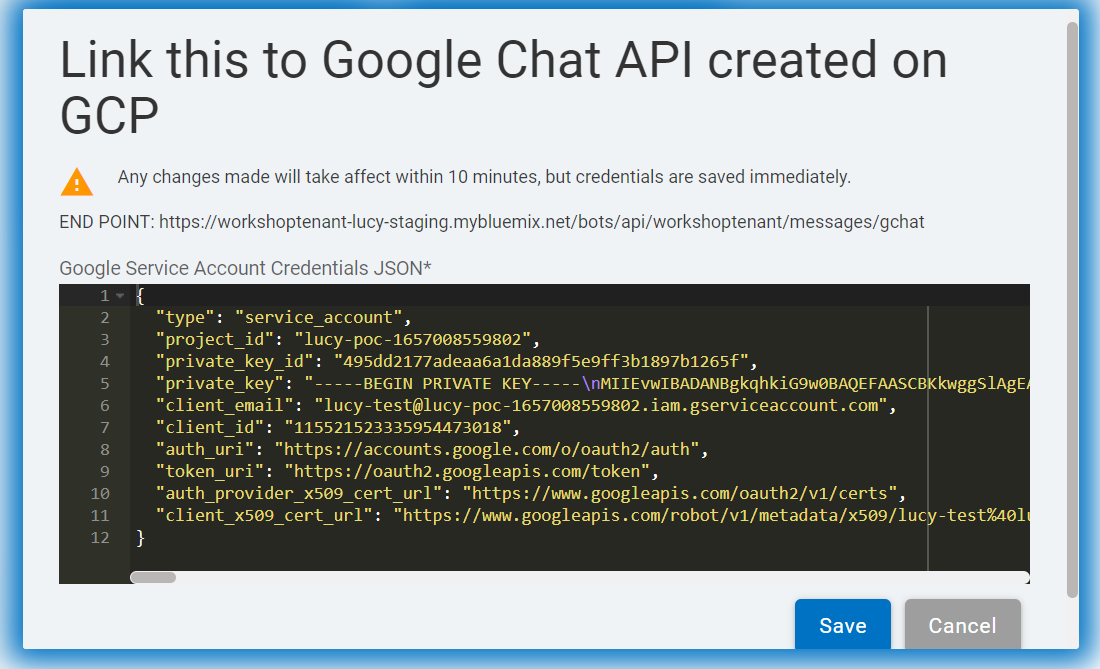 - Once the changes are saved, it becomes available for the selected tenant under the channel configuration console to configure the gChat channel.