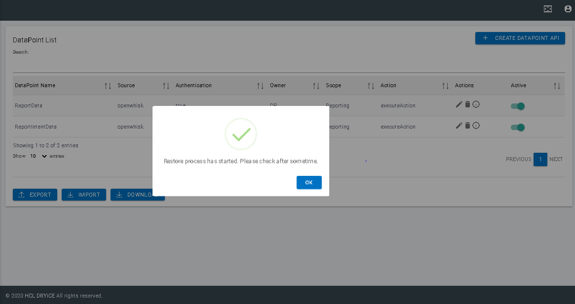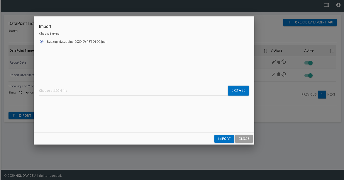 A backup can be restored by clicking on the Import button. Clicking on the button, fetches a list of backups present on the cloud, for that console, sorted based on the most recent backup created. The naming convention of the file has been kept for the ease of end-user which goes by the format: Backup_Console Alias_Timpestamp