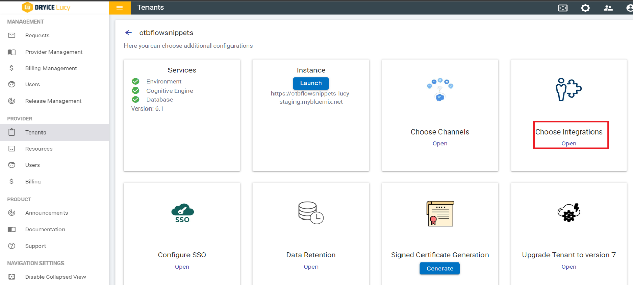- In tenant’s configuration page, click on Open in “Choose Integrations” card.