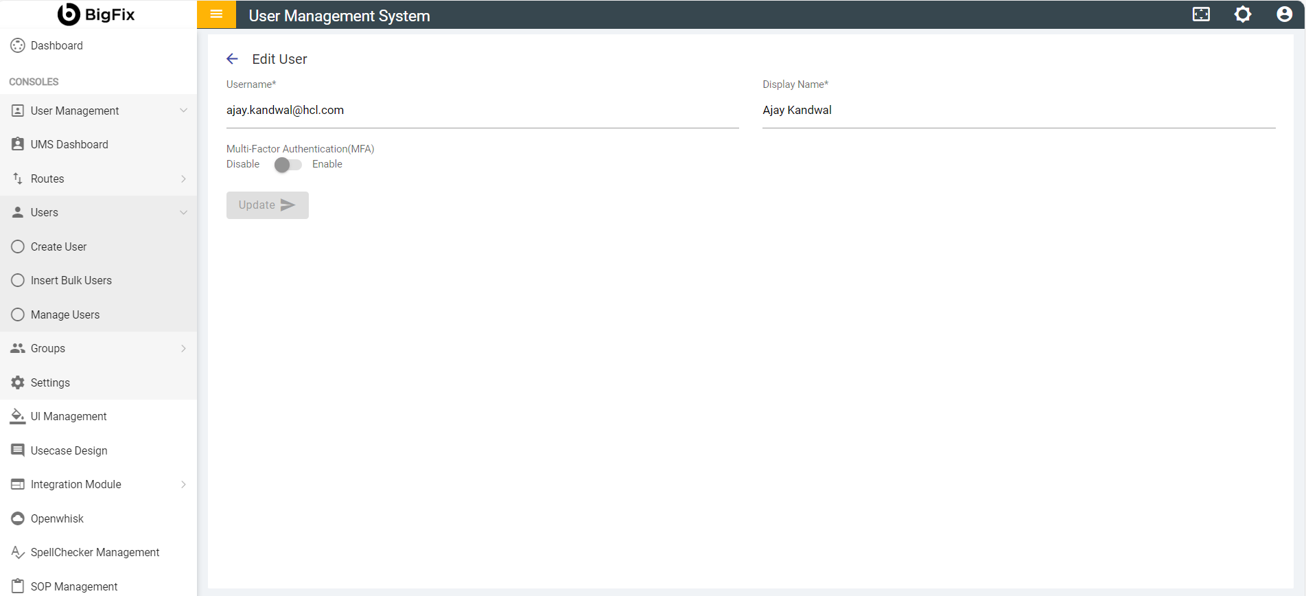 - If the MFA has been activated for all the users and one of the users is facing problem, the admin can use this section to temporarily disable the MFA for that respective user. This enables the user to access BigFix AEX without MFA.