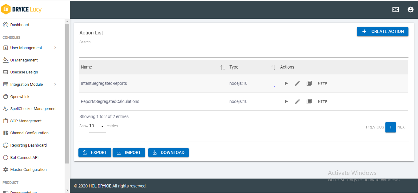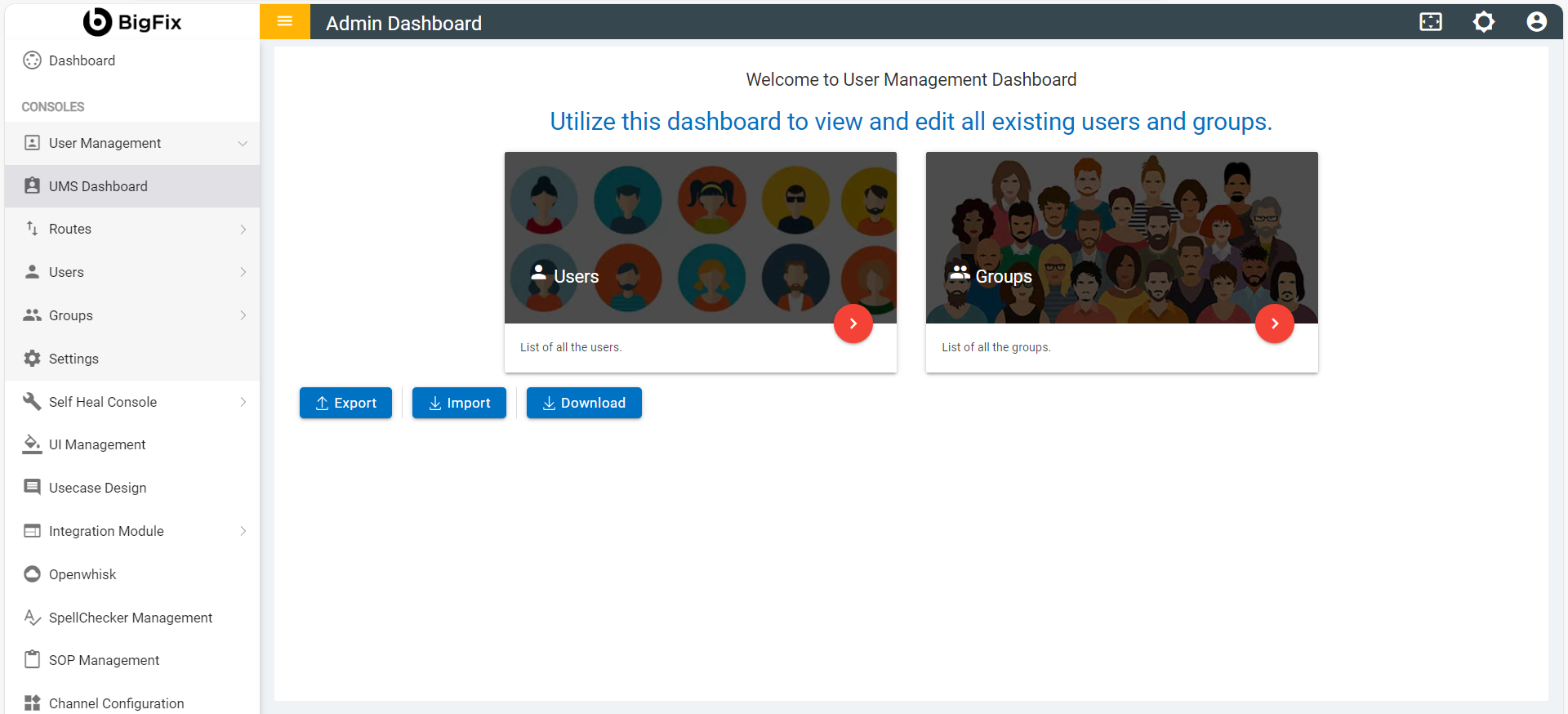 The buttons to Import/Export/Download appears on the homepage of console (if the console has any) or on the main route of the console as shown in figure below: