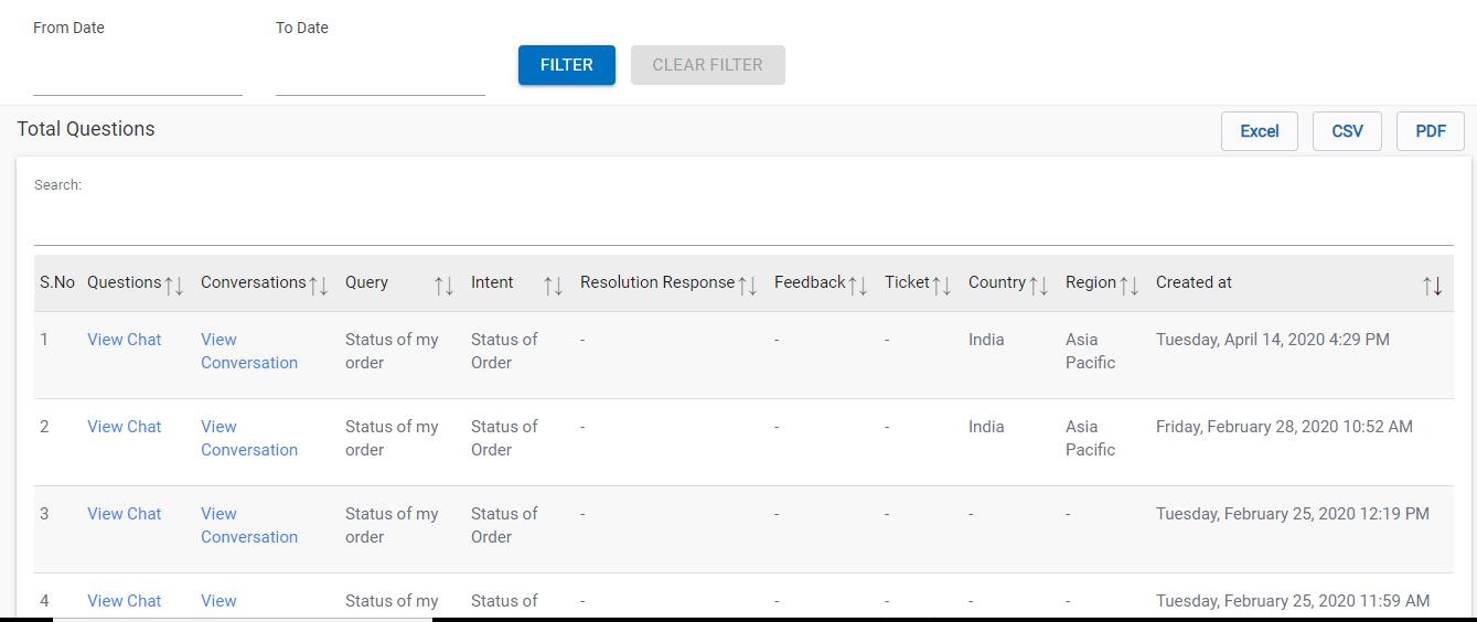 Under the detailed view, user can search/ filter the displayed list based on the attributes such as Questions, Conversations, Query, Intent, Resolution Response, Feedback, Ticket ID created, Country, Region, and Created Time.