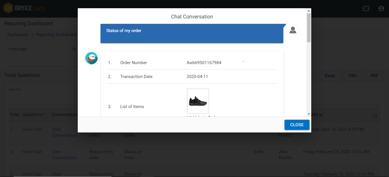 View Conversation displays the entire set of conversations that took place between the Chabot and the user in a particular session, provided the session was not interrupted by the reloading of the page or the user logged out and logged in back.