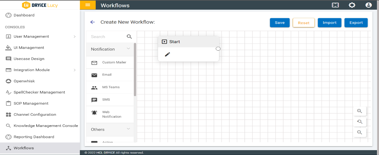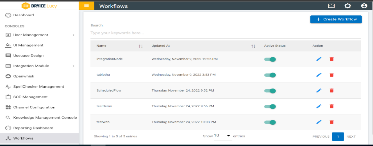 - In the Workflow List page, there is “Create” button in the top right side of the screen and clicking on it opens a new page where you can create a new flow.