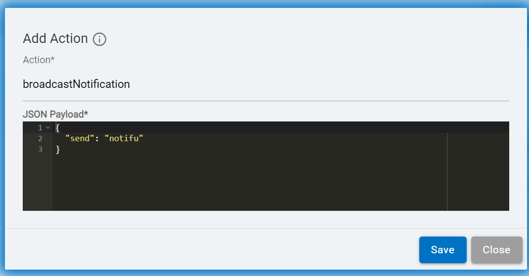 - Action: Click on the edit icon of Action node and fill the mandatory fields. Select an OpenWhisk function name from Action drop-down box and fill JSON payload. After that click on the Save button.