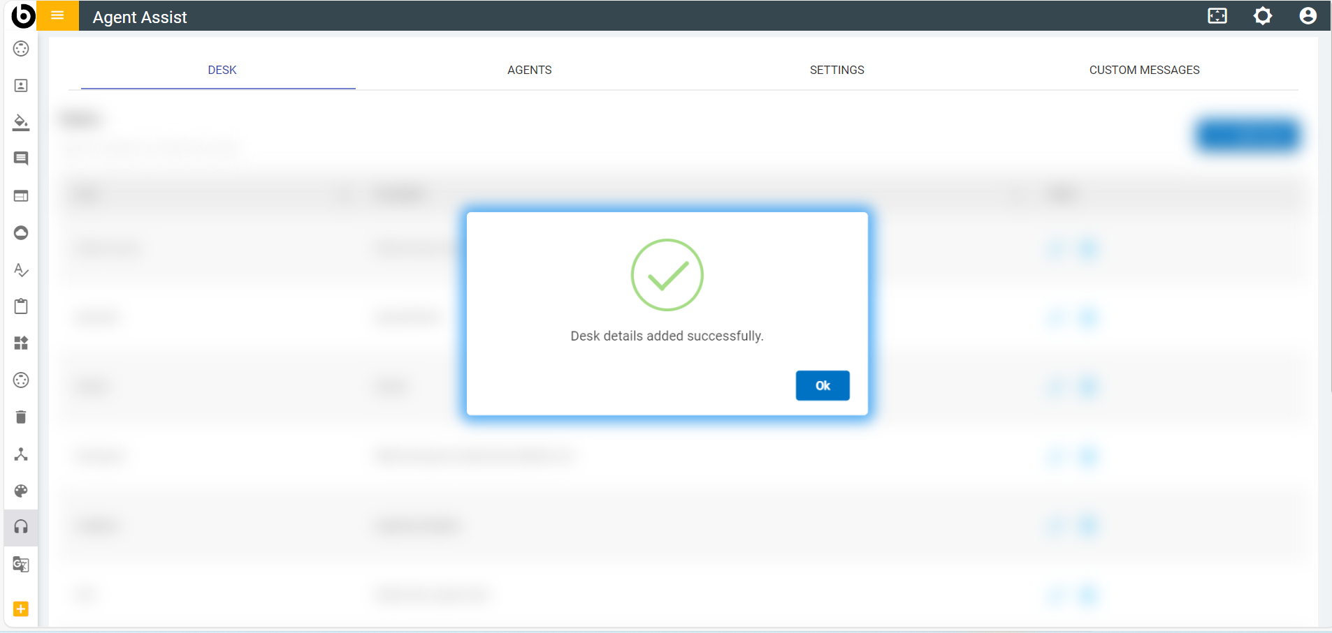 - Enter the Desk Name and Description and click Add. The following success message appears: