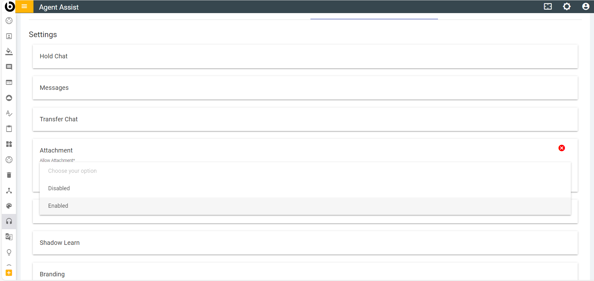 Attachment The admin can enable or disable the attachment. This is reflected in the Agent Chat Dashboard. Figure 1. Figure 56 - Attachment