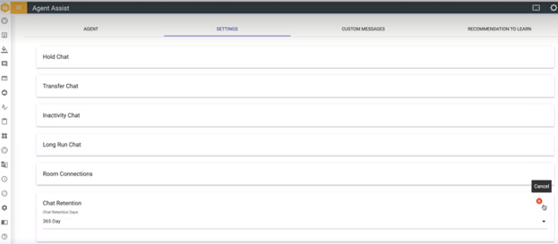 Chat Retention It configures the period for deleting the conversation between agent and user. Figure 1. Figure 19 - Chat Retention