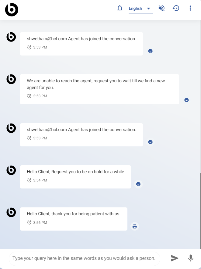 - When a user is on hold, the hold icon disappears from the agent chat window and the active session, and resume icon becomes available to resume the chat. When the agent resumes the chat, a chat resume message which is set by Admin/Supervisor reflects in the Agent chat window and BigFix AEX chat window.