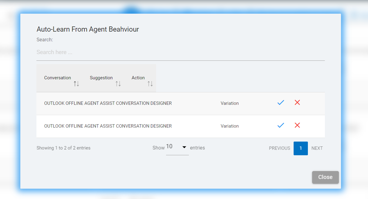 - The SME clicks on the “Recommendation to Learn” tab in Conversation Designer. The following page appears where SMEs can view the list of variations or sops that have been approved by the supervisor.