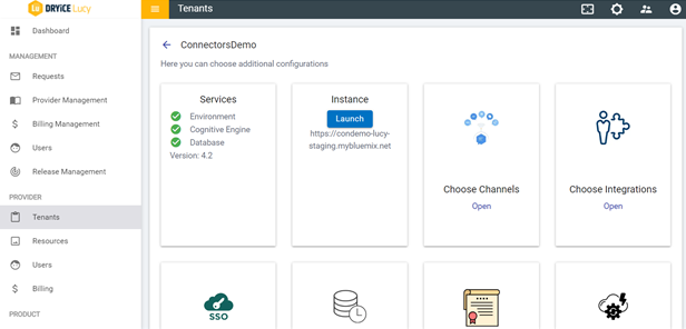 available in actions column. - In tenant’s configuration page, click on Open link on “Choose Integrations” card.