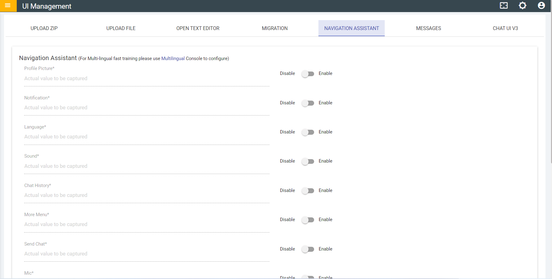 - This feature can be seen under the UI Management console as shown in Figure 2 – Navigation Assistant Form. Enabling or disabling any navigation element using the toggle enables or disables the navigation element from the walkthrough: