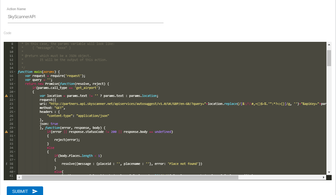 As a detailed example, suppose you want to create an OpenWhisk action to integrate with an API provided by the company, Skyscanner, to find out various flight options between a Source Place and a Destination Place on a particular date.