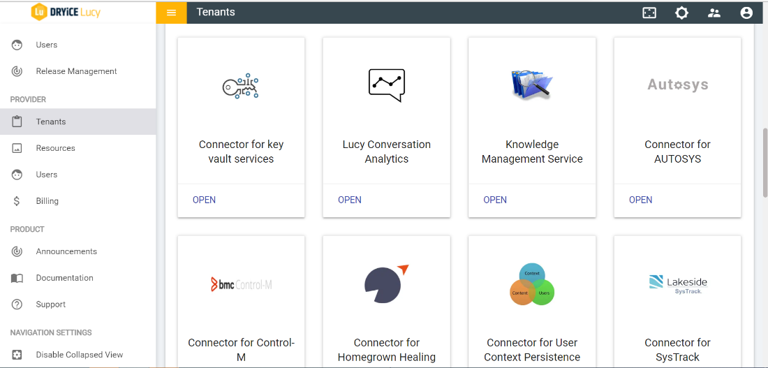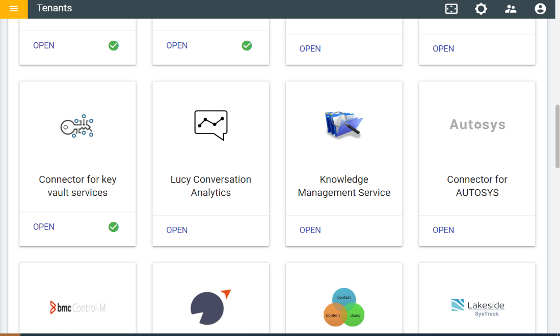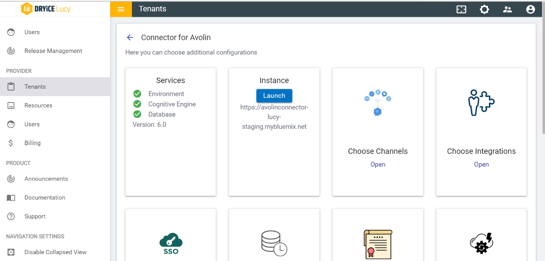 Actions column. - In tenant’s configuration page, click on Open in “Choose Integrations” card.