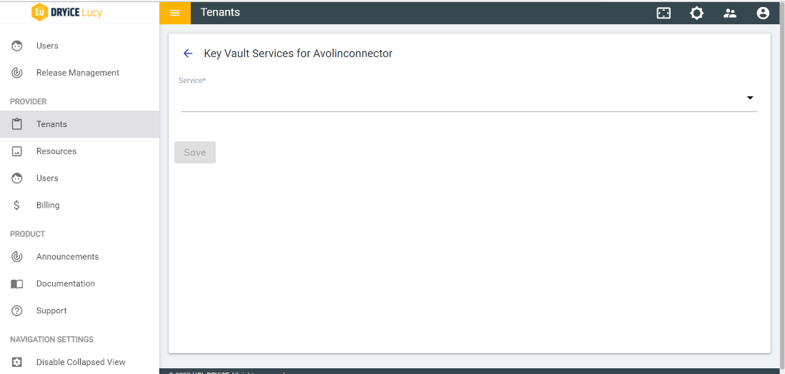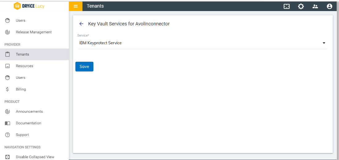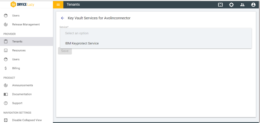 - The service has a dropdown which has IBM Keyprotect service listed. On choosing the service option SAVE button gets enabled. Save the integration to enable the service.