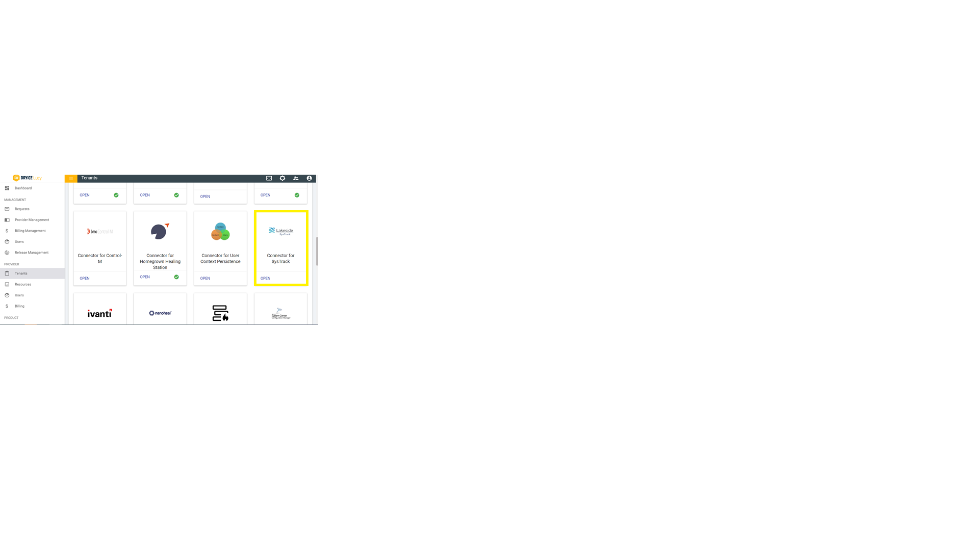 available in Actions column. - In tenant’s configuration page, click on Open link on “Choose Integrations” card.