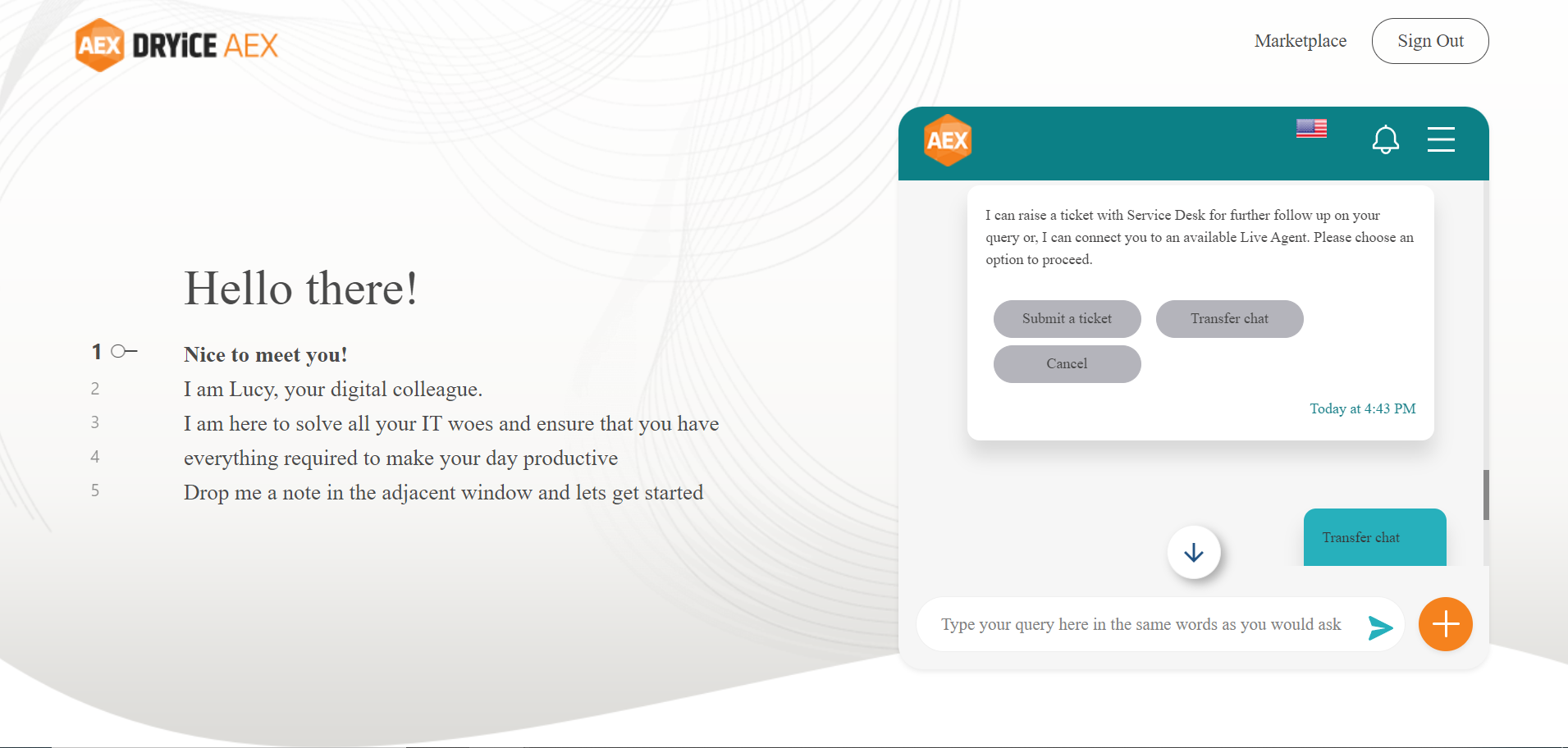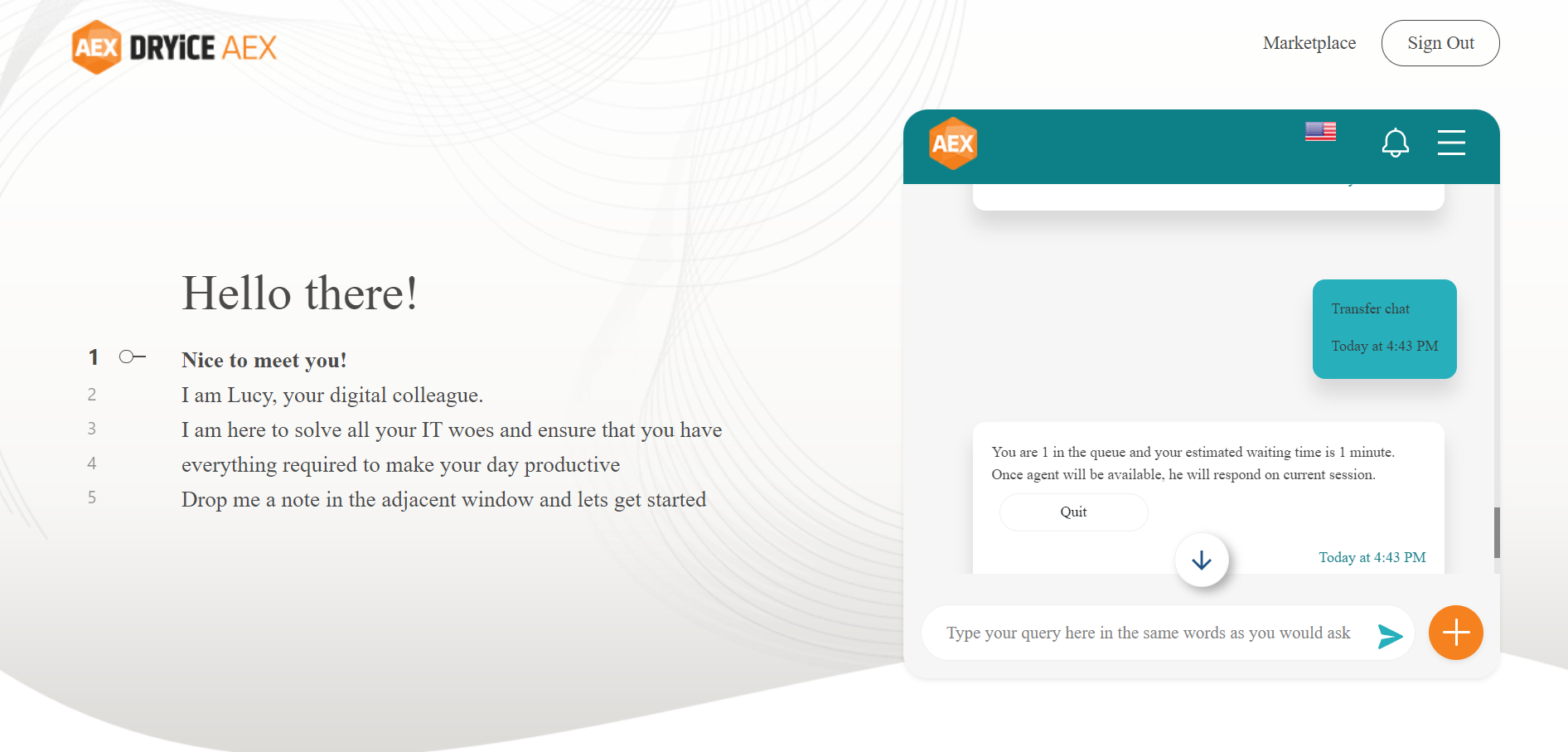 The user gets the message that he/she is connected to the agent (with the agent’s name) in the BigFix AEX chat window. The user writes the message “hello”