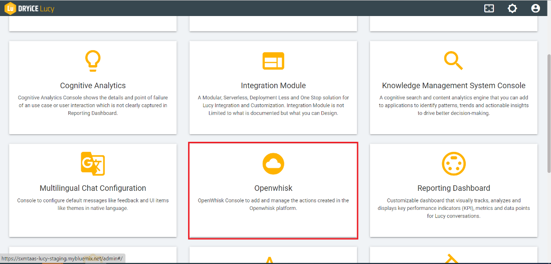 - To confirm that the connector has been successfully activated, check if an Openwhisk Function called query_sccm has been created. To check this, go to the BigFix AEX Cognitive Console for your tenant and click on Openwhisk card or Openwhisk from the left panel of the cognitive console.