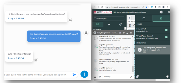 - An example of the live chat integration with BigFix AEX and ServiceNow connect chat is shown below (chat can be disconnected by typing Disconnect on the agent side):