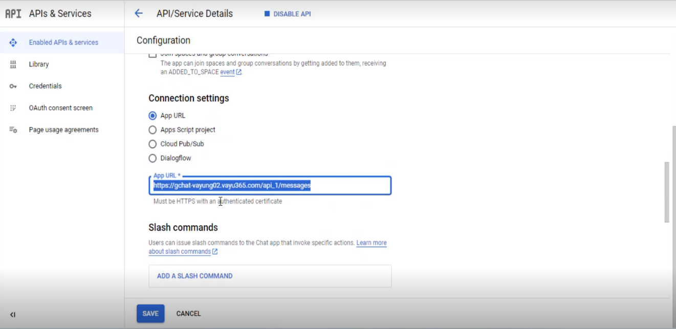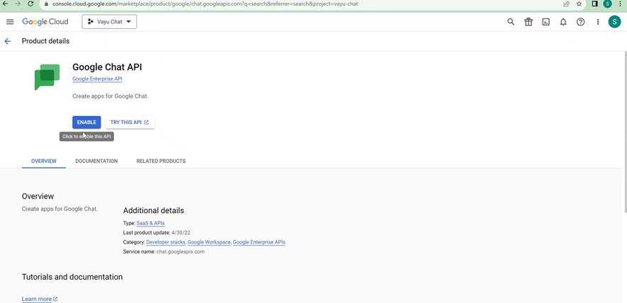 - Go to Google Cloud Console 🡪 Chat API and click Enable to enable the Google Chat API on the Google chat API page to connect google cloud project.