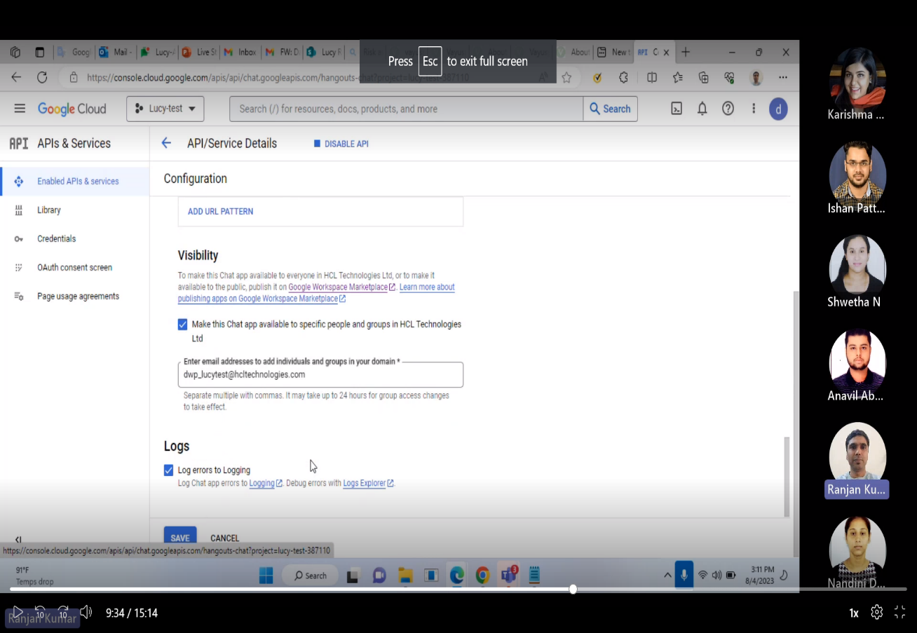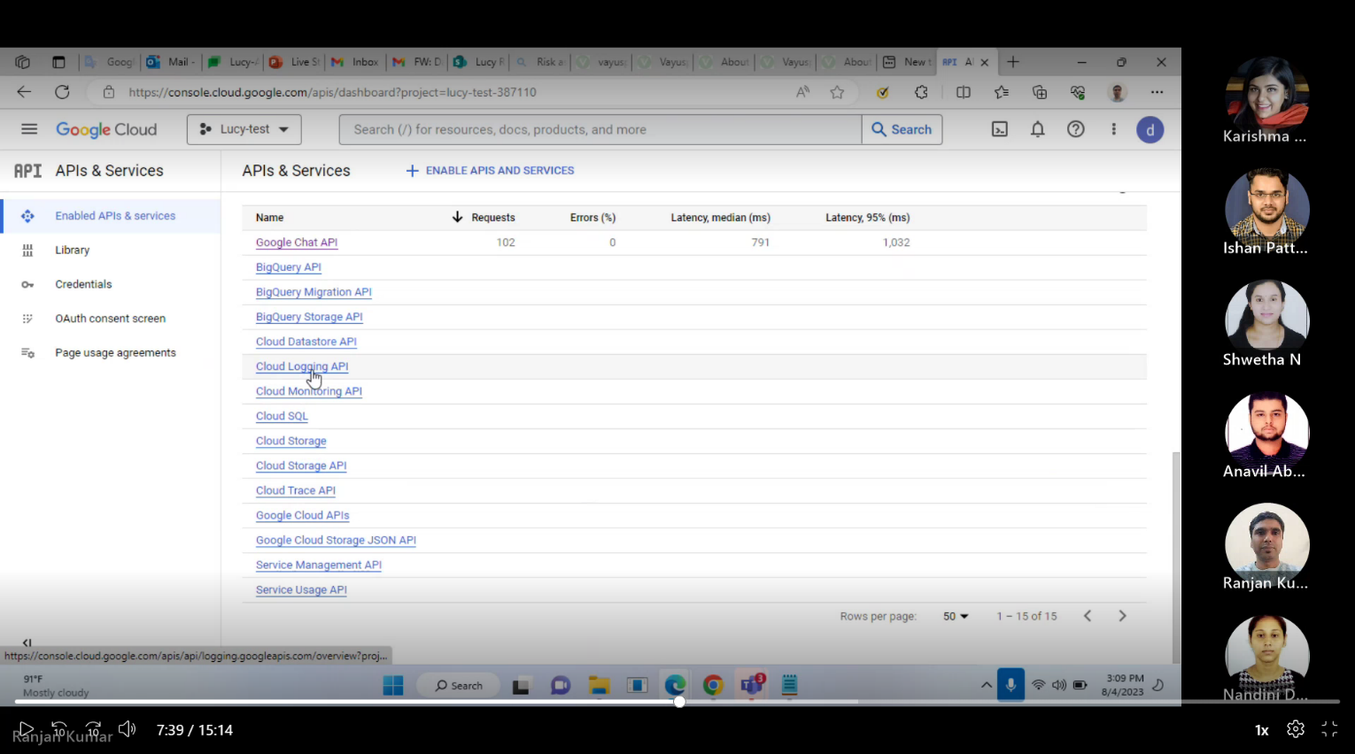 - After selecting Enabled API’s and services, enable and click Google Logging API on the APIs and services dashboard.