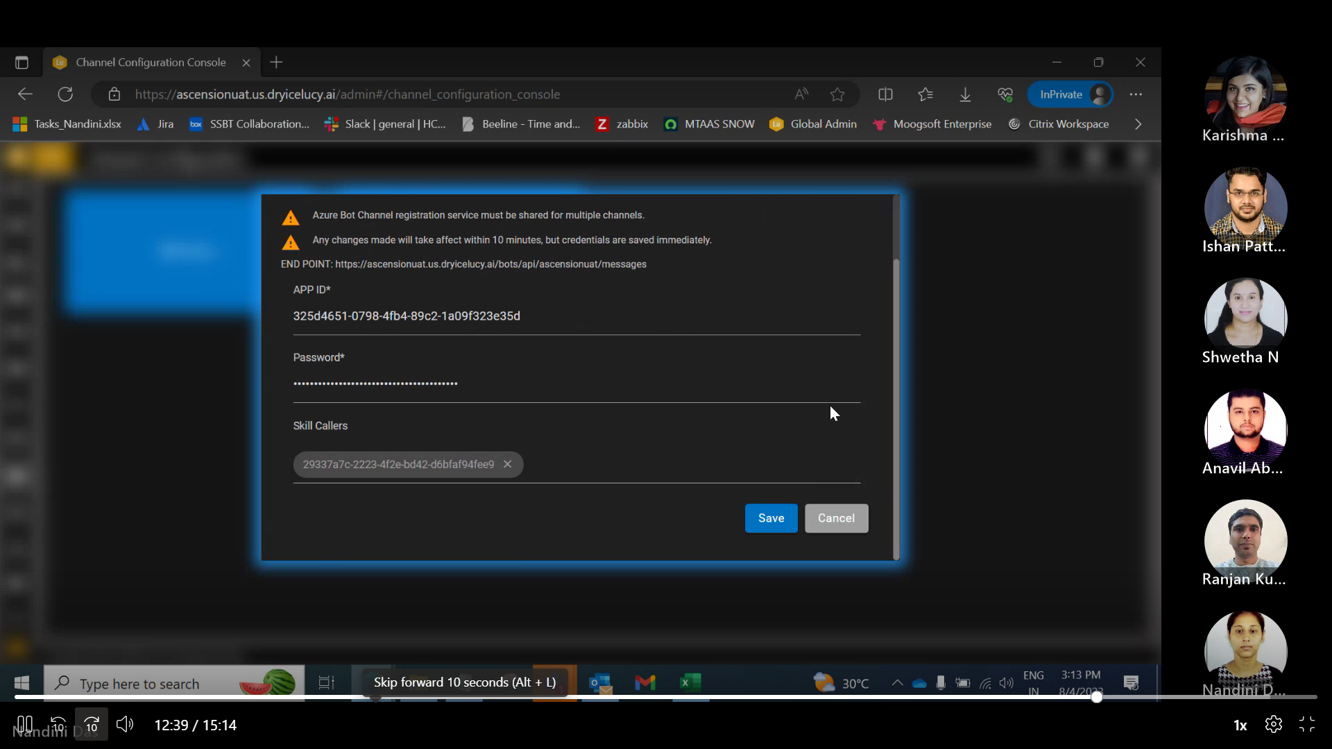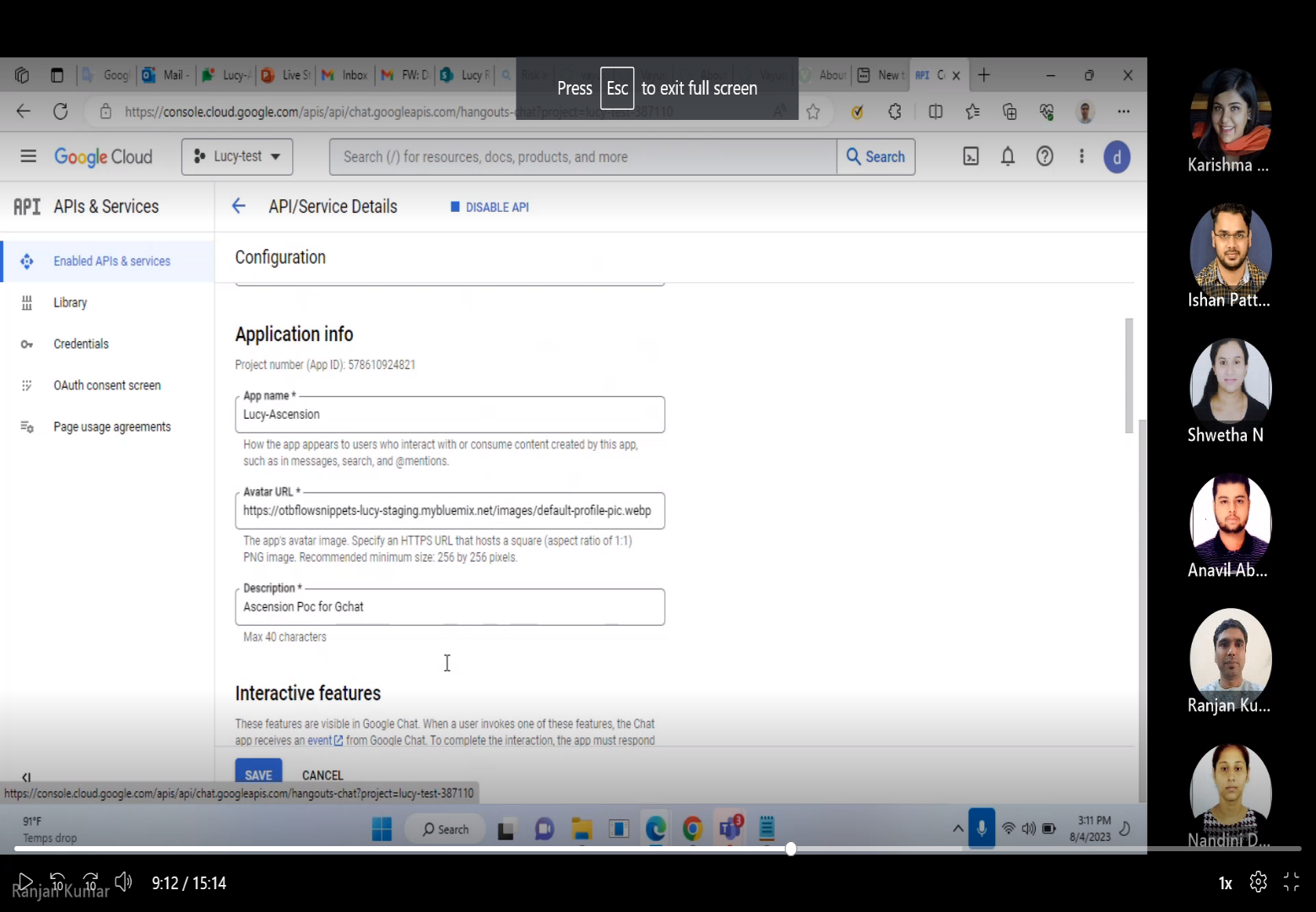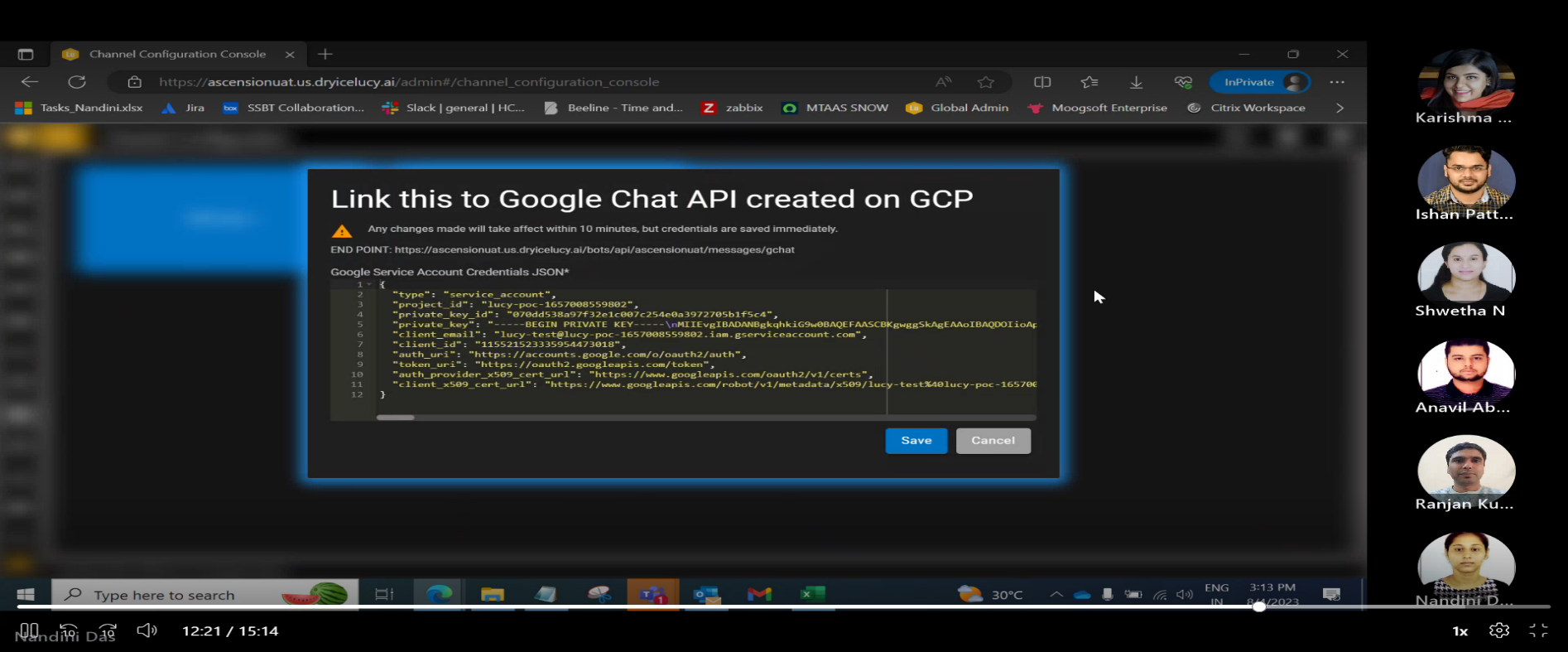 - Click on the gChat card to configure the gChat channel then click Save. Once it is done, your bot is configured for your selected tenant, and you will be able to use BigFix AEX over same.