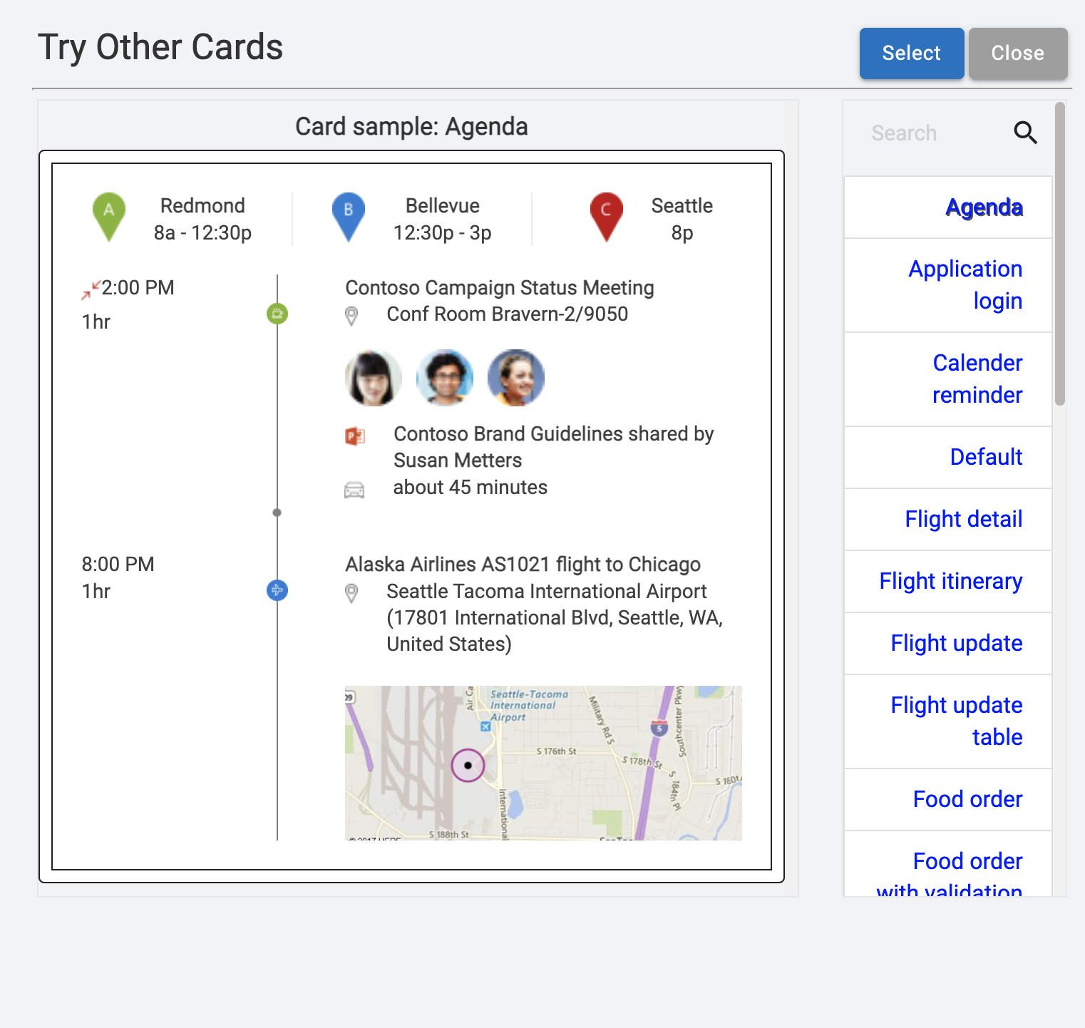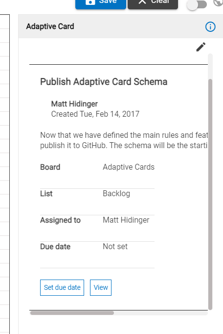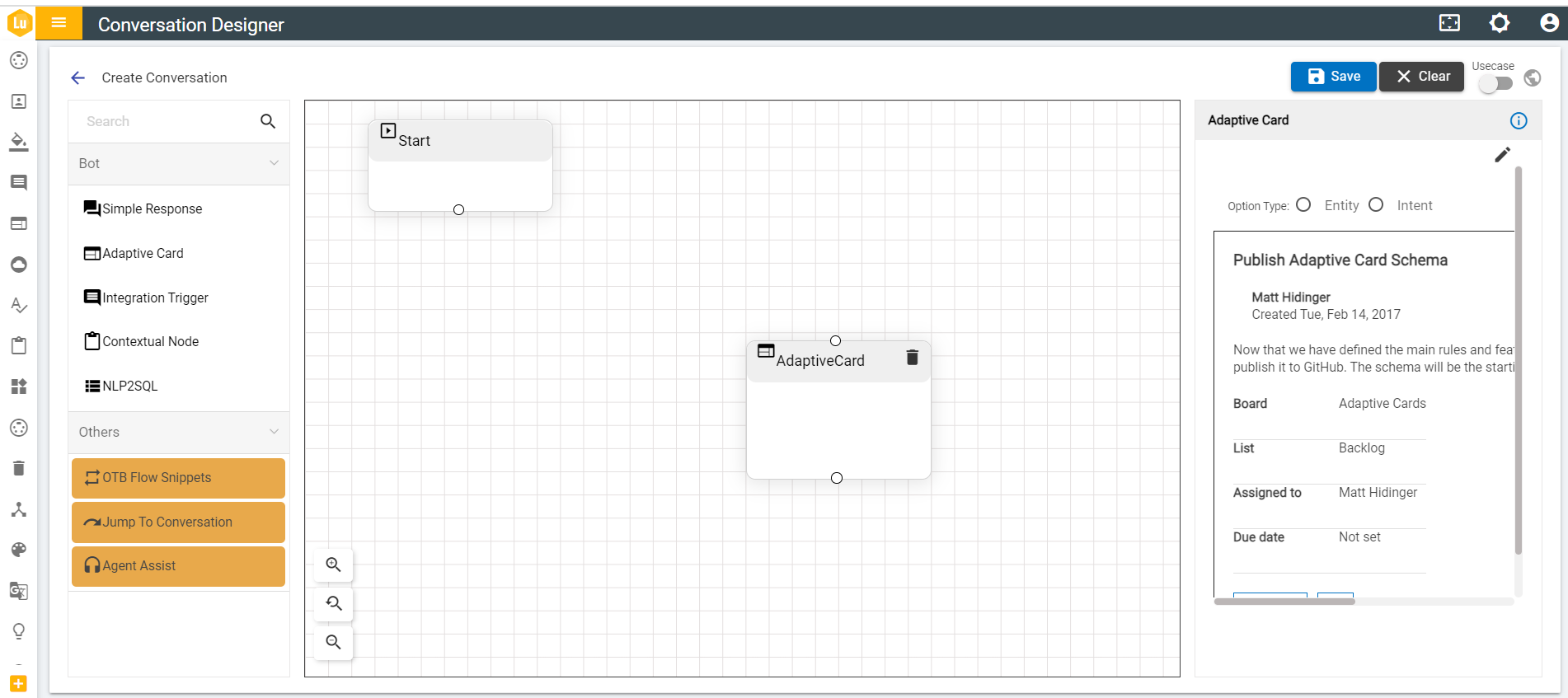 This response is used to add an adaptive card as a Simple Response. The response it used to get an adaptive card for MS-Teams. On drop of the response to drawable conversation area, we get a default adaptive card template in the form: