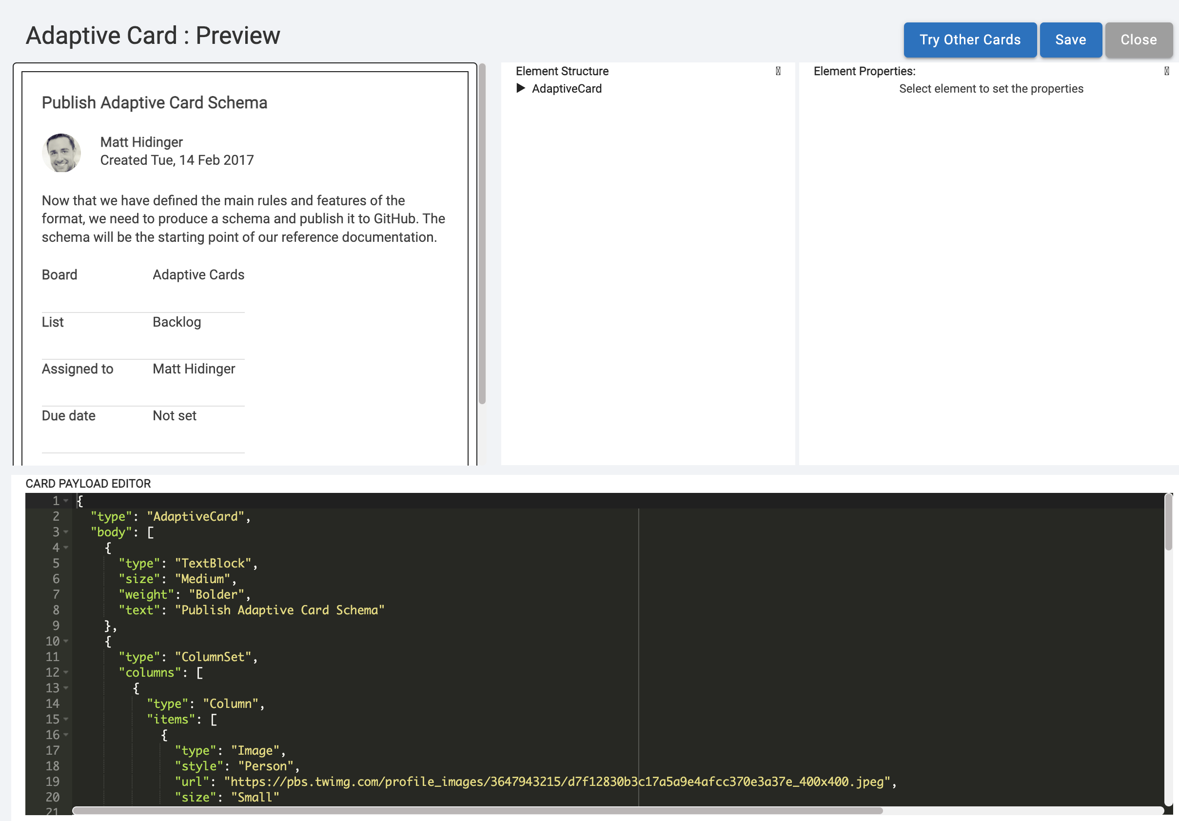 The edit icon in the form opens a modal which shows JSON Editor, card view, Element structure and Element properties.