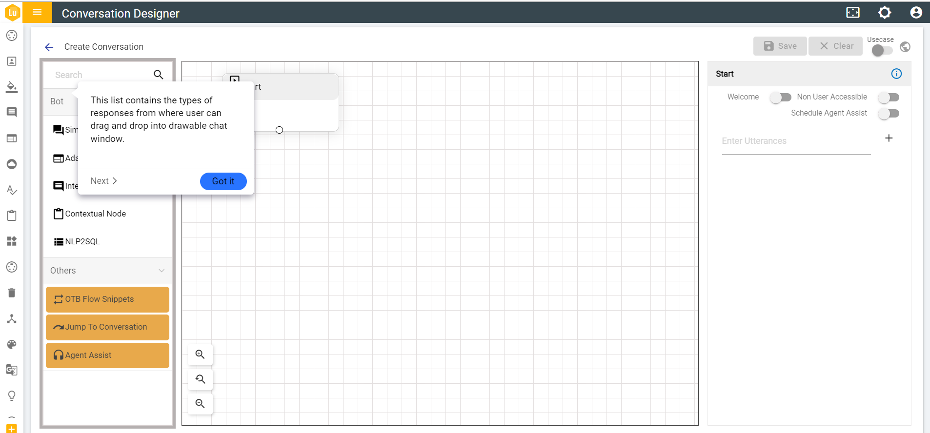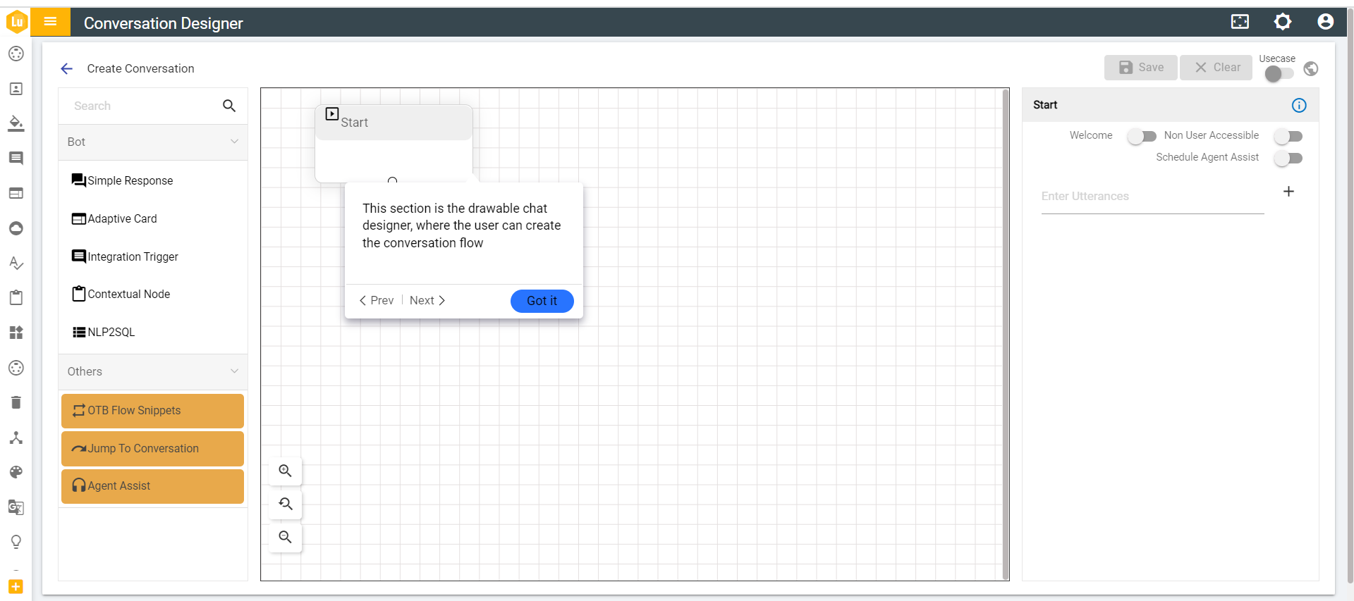 For the first time users, this multifunctional console may seem quite complex. To overcome this issue, the developers have integrated a general walkthrough of the console via Conversation Designer Tour. As soon as the first-time user gets on the page, the Conversation Designer Tour is triggered which guides the user through the general functionalities of the console. This tour is also available on the List page and on the Update page.