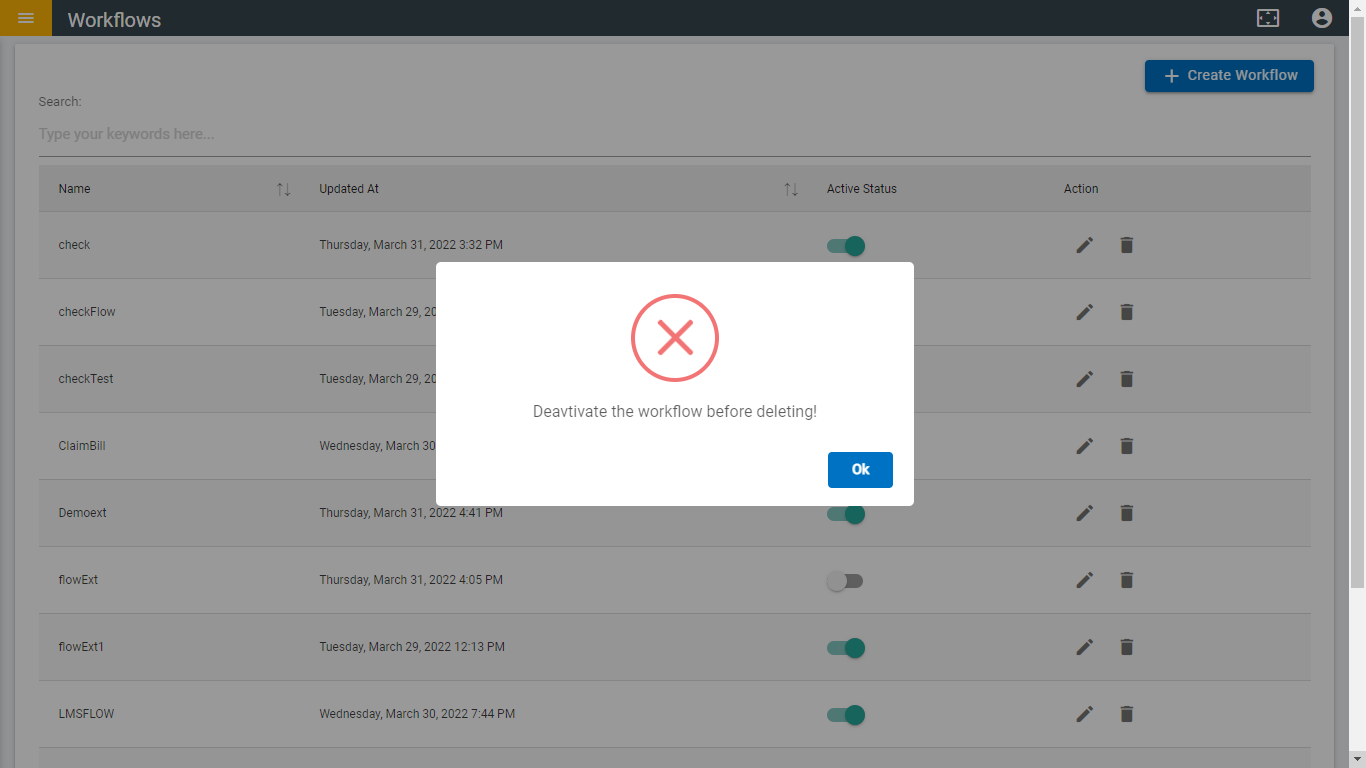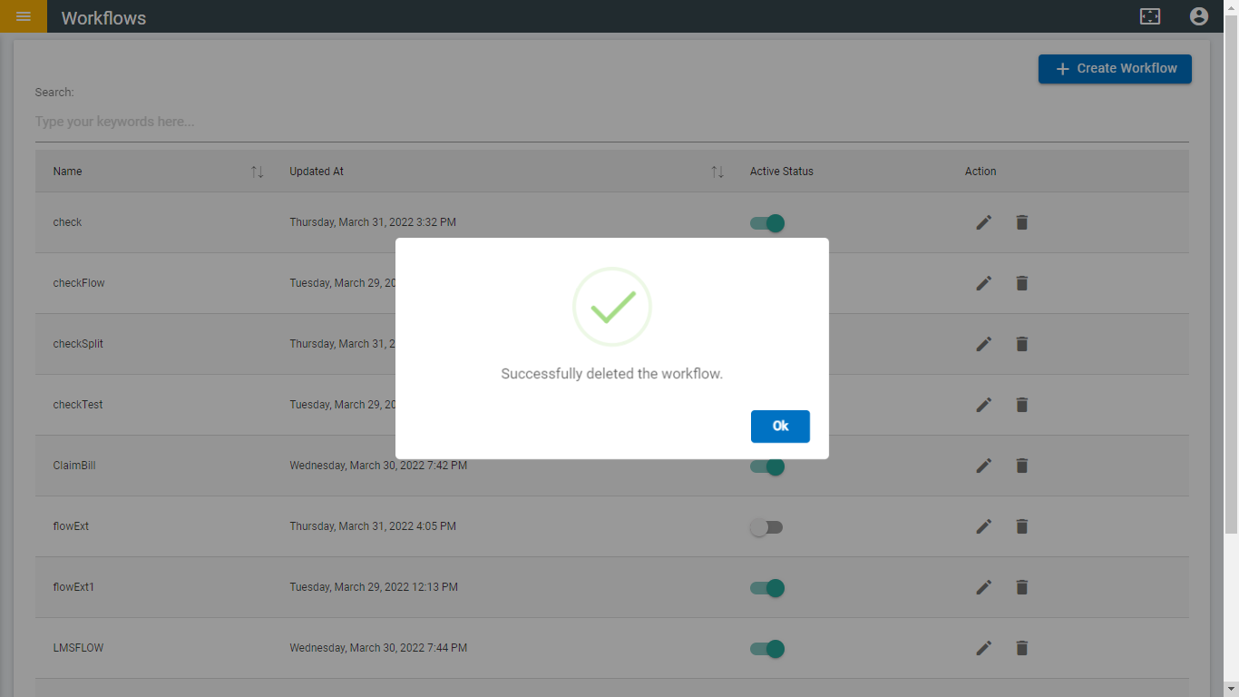 - Click on “Ok”, and the workflow will be deleted permanently from the List page and the following pop-up will be shown.