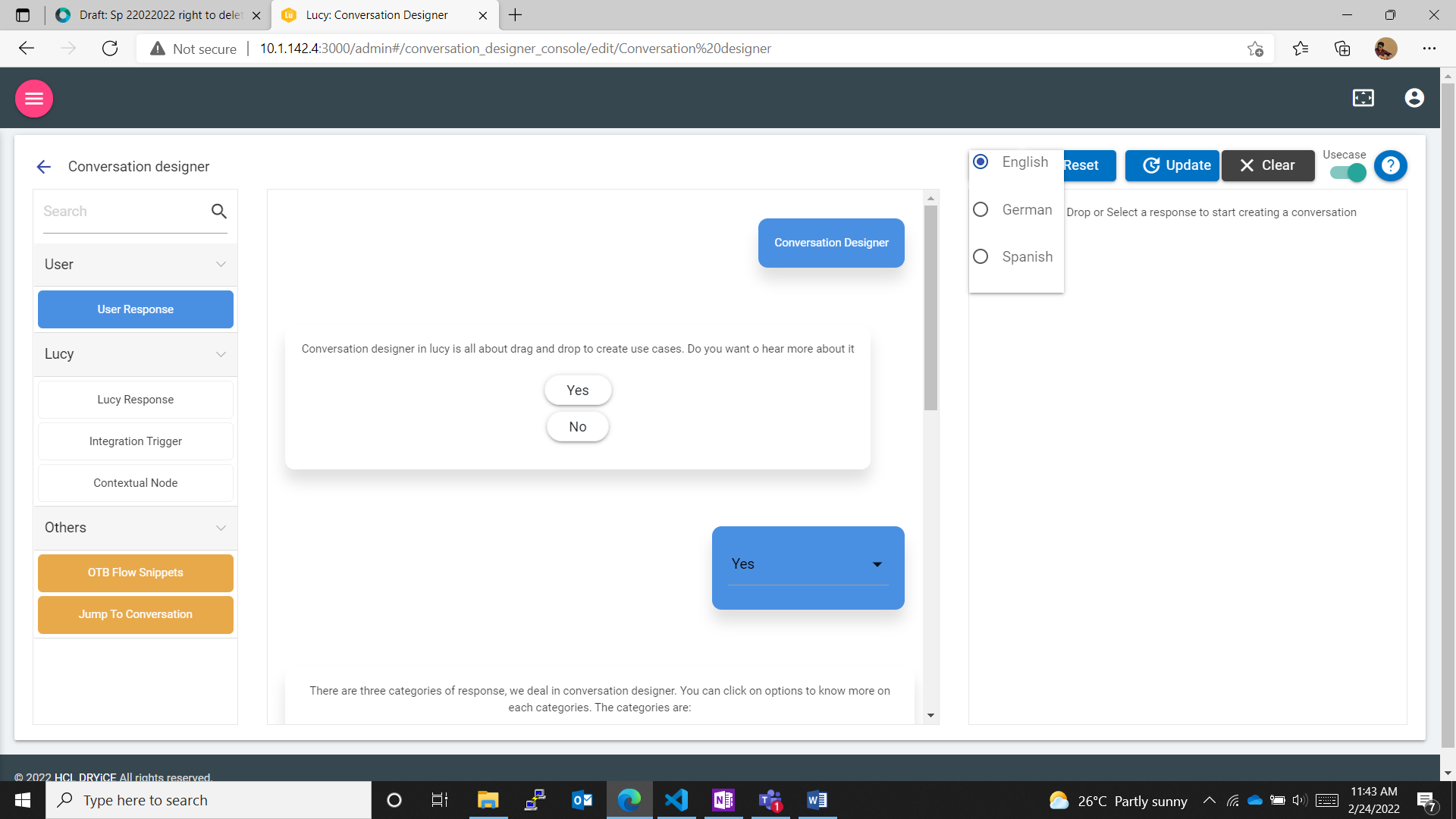 - Now, after switching the language, the user can update the flow using the Update button and can train the conversation flow in that switched language. The Change Language button is not visible on the Create Conversation page. After creating the flow, when the user saves the conversation, independent flows of all the available languages in that tenant are created in the JSON. When the user tries to edit any conversation and enters the Edit page, the Change Language button is visible there. As soon as the user changes the language using the dropdown menu, the flow is displayed in the selected language as described earlier. The flows are independent to each other, changes made in one flow, such as, changes made in ‘Spanish’ does not affect the flow in ‘English’ or ‘Dutch’. All the flows in different languages are not co-dependent and making changes to one flow does not affect other flow.