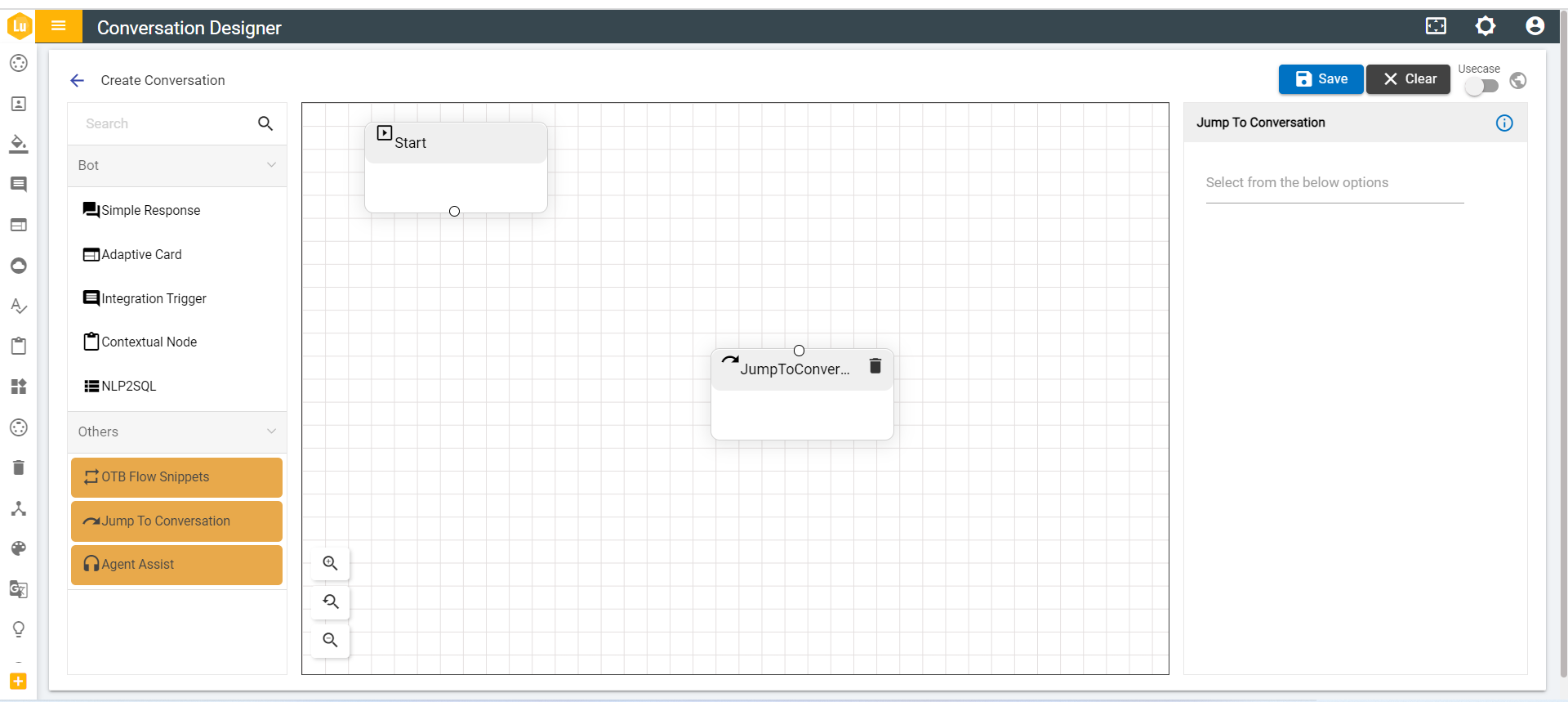 In the Jump To node, the response type is used to jump from one conversation to another conversation.
