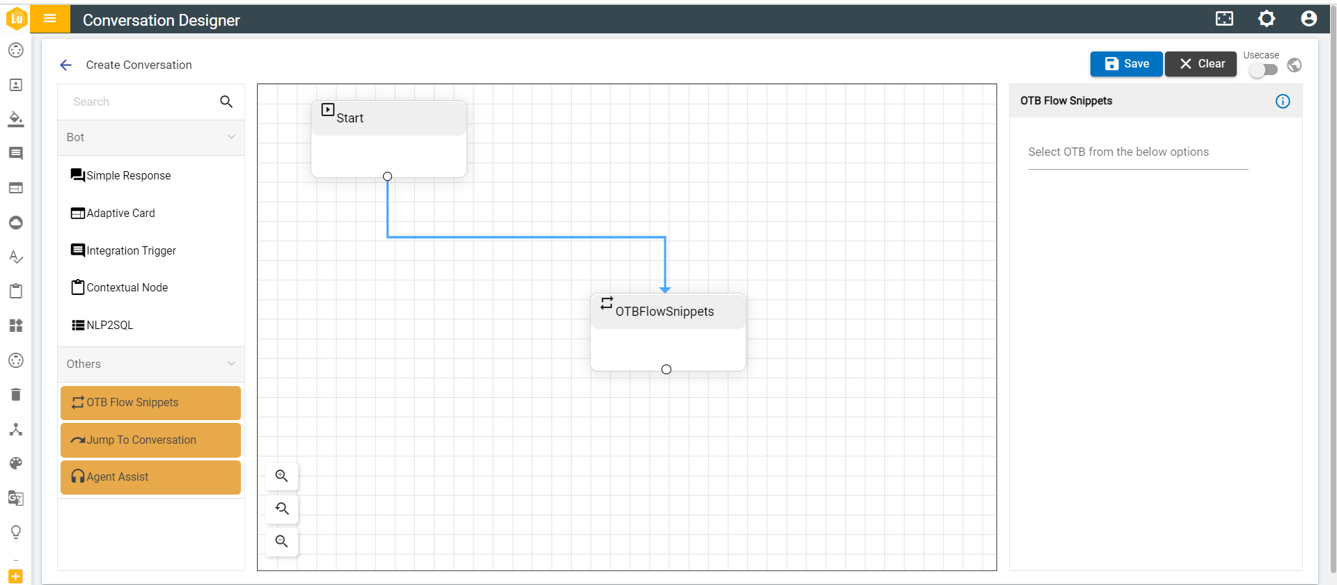 These are all the nodes that the user can use to create any conversation flow that is intended. Other than these nodes, the console has one other node, that is, OTB Flow Snippet node.