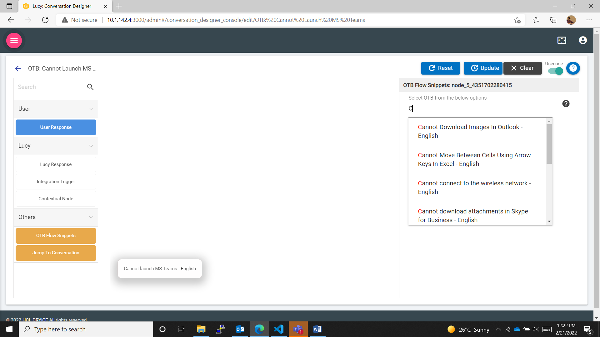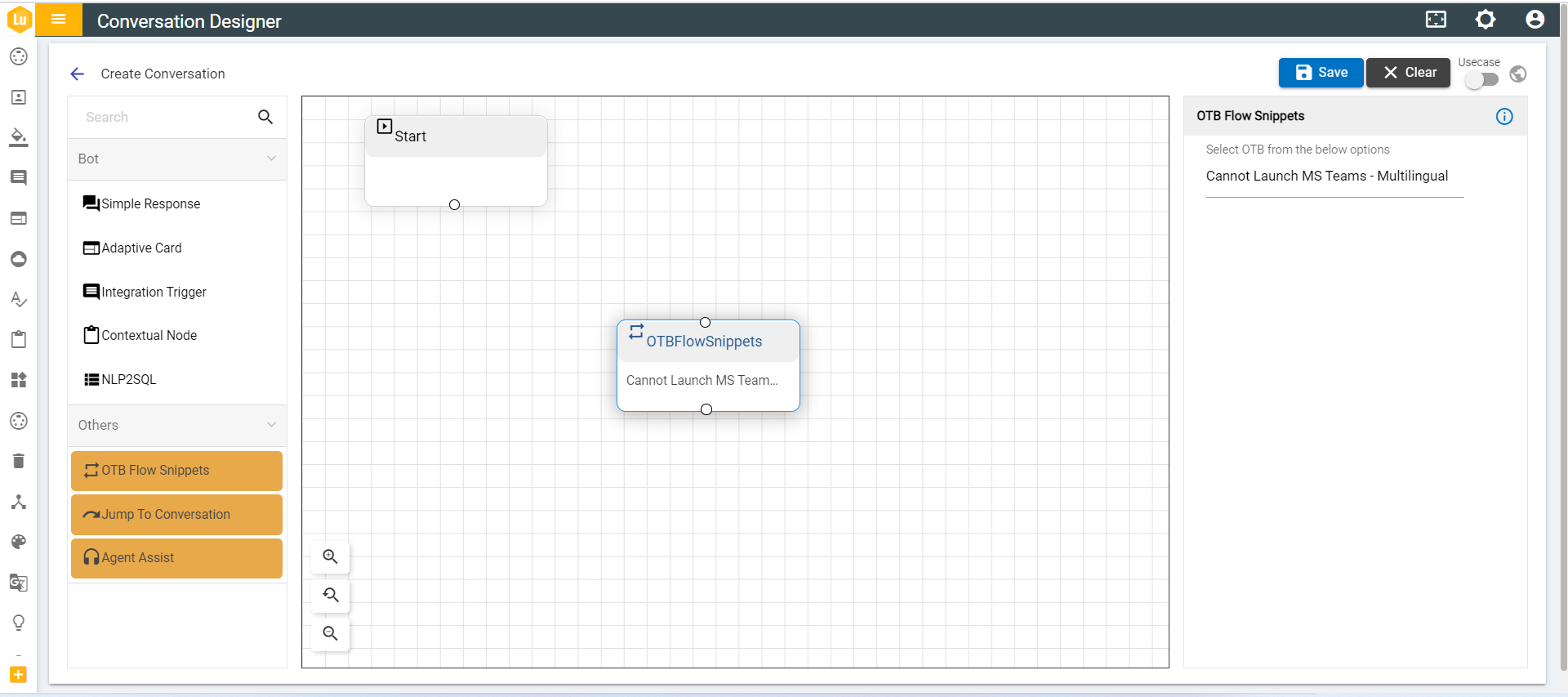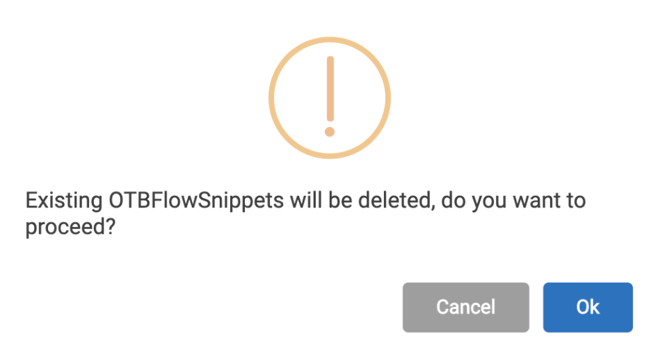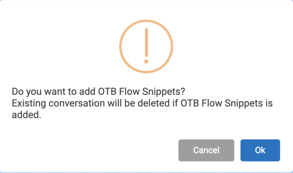 - If the conversation section has node or series of nodes (response type User Response, Simple Response, User Option Response, Integration Trigger) then, if end user tries to add OTB Flow Snippets, a confirmation is required by the end user stating if he wants to add OTB Flow Snippets. Then the existing conversation is removed.