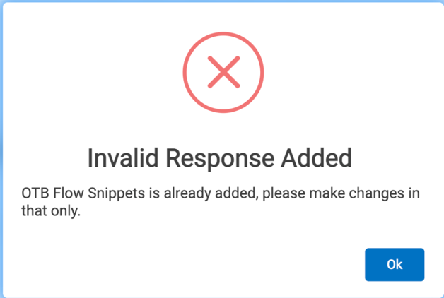 The user creating a conversation must note that if there are some response type nodes already existing in conversation section, while adding OTB Flow snippet the following validations are applied: