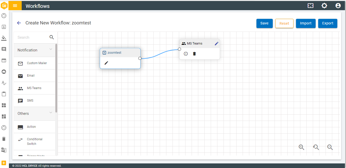 Workflow has Zoom feature that has Zoom In, Zoom Reset, and Zoom Out options. When user hovers over the canvas area, zoom icons will be visible and when cursor is outside the canvas area, zoom icons aren’t visible.