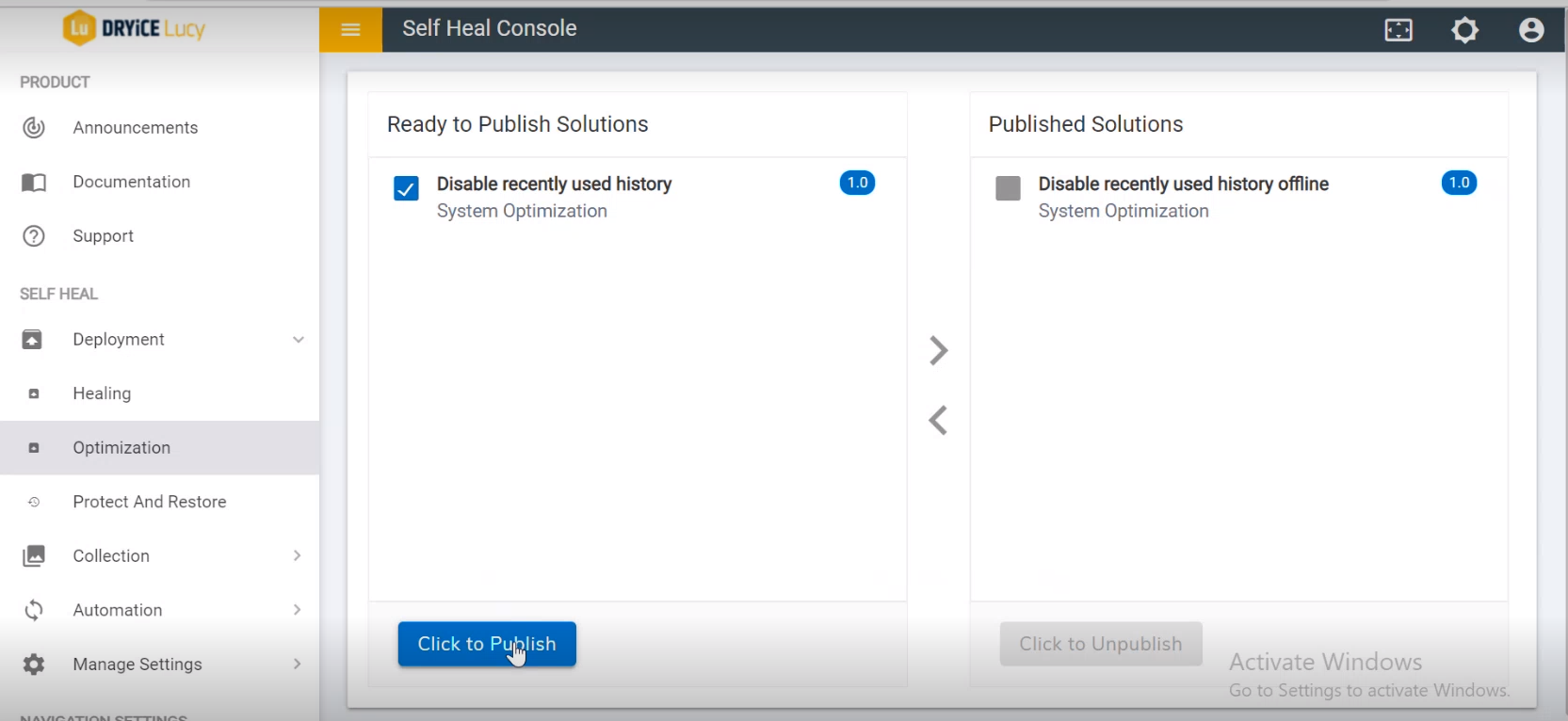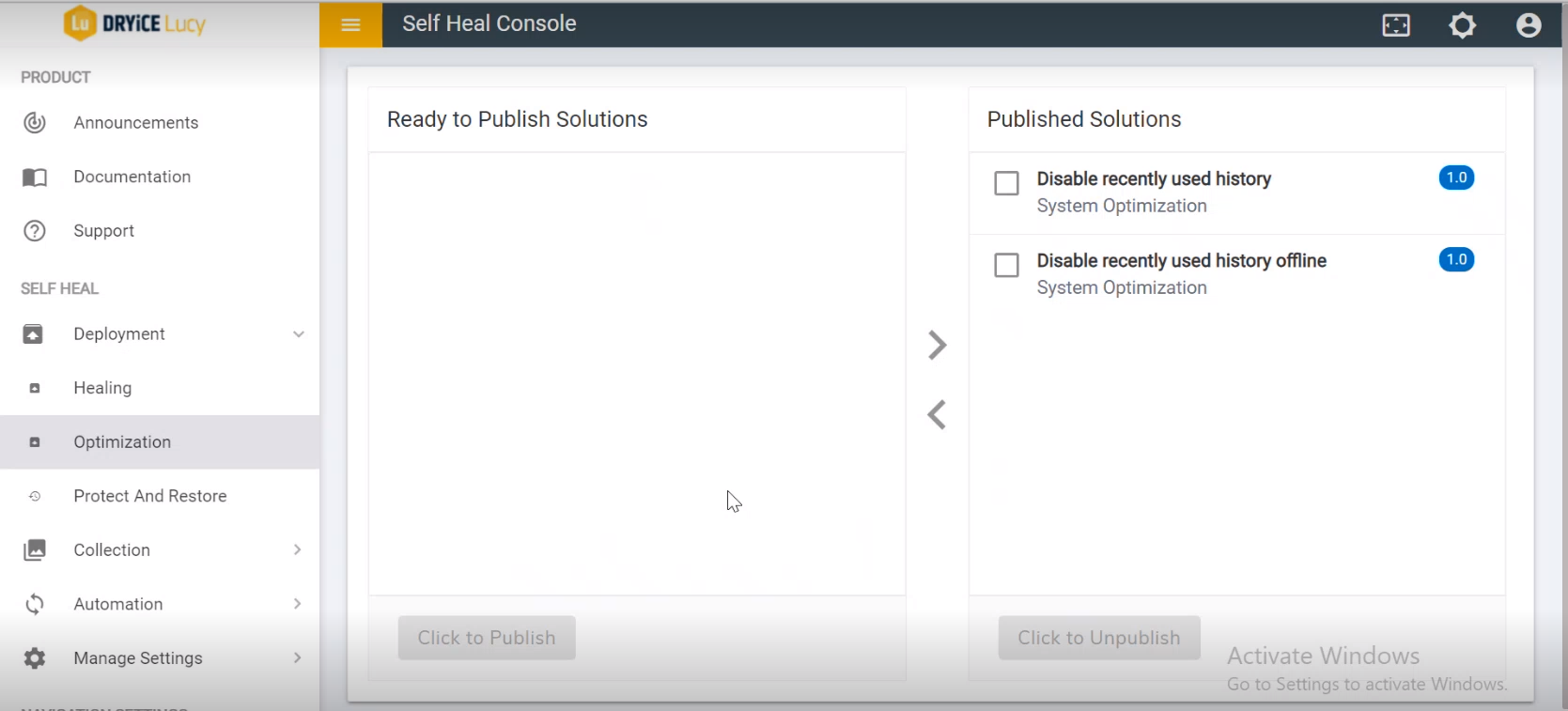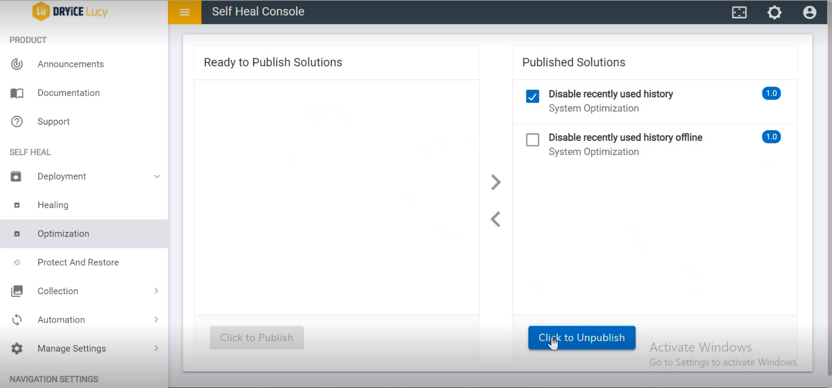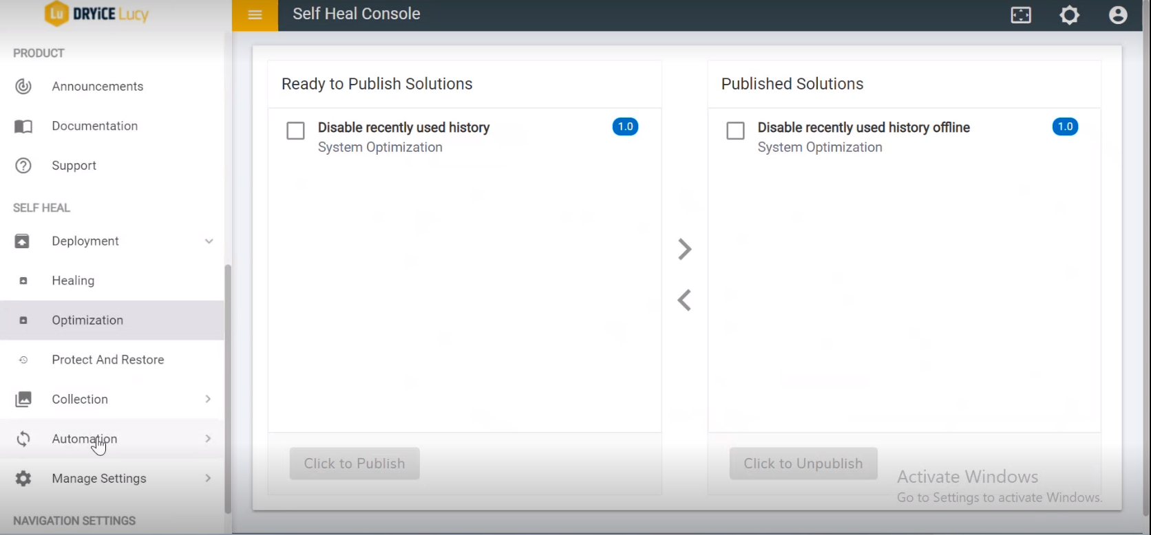 - When the automation module is created with “Optimization” as Solution Type, ‘it comes under the Ready to publish section. On clicking the Click to Publish button, the solution moves to the Published Solution section.