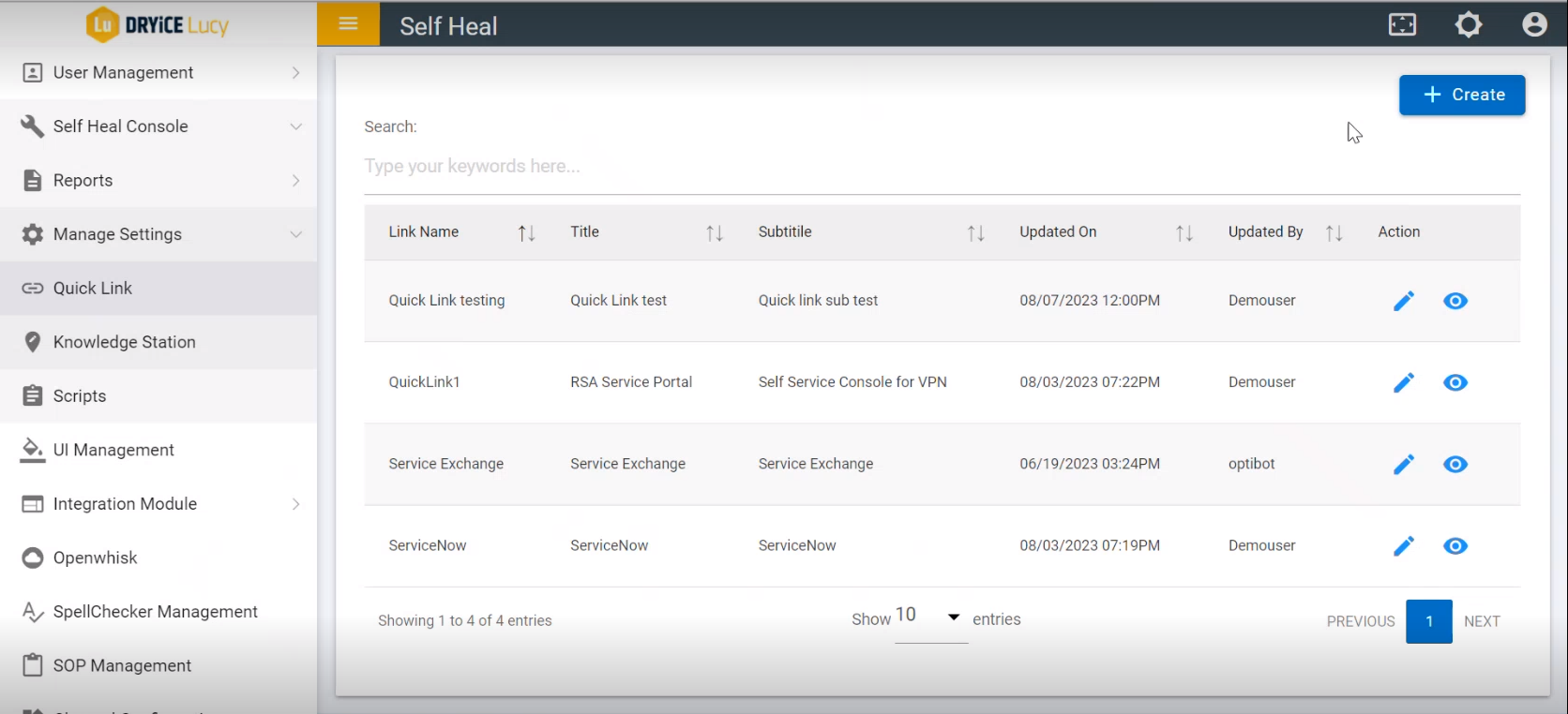 - Admins can create URLs for client apps by clicking on the Create button on the top right corner of the Quick Link page.