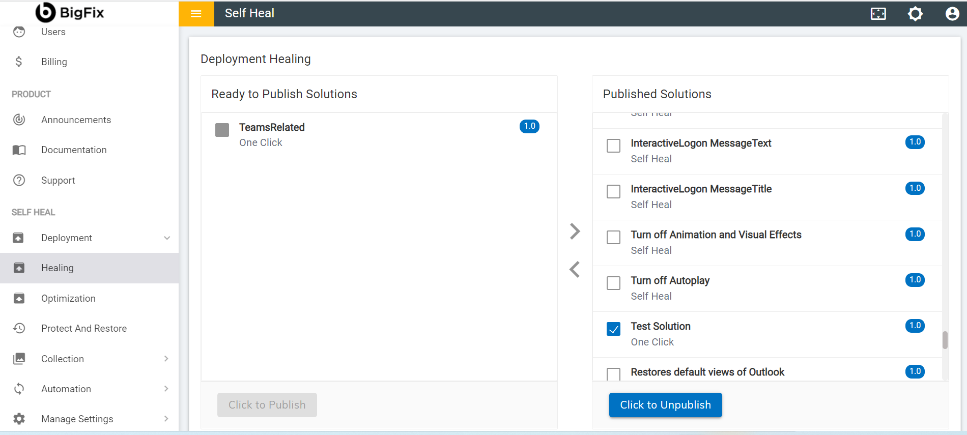- To modify a published solution, the admin must unpublish that solution by clicking on Click to Unpublish.