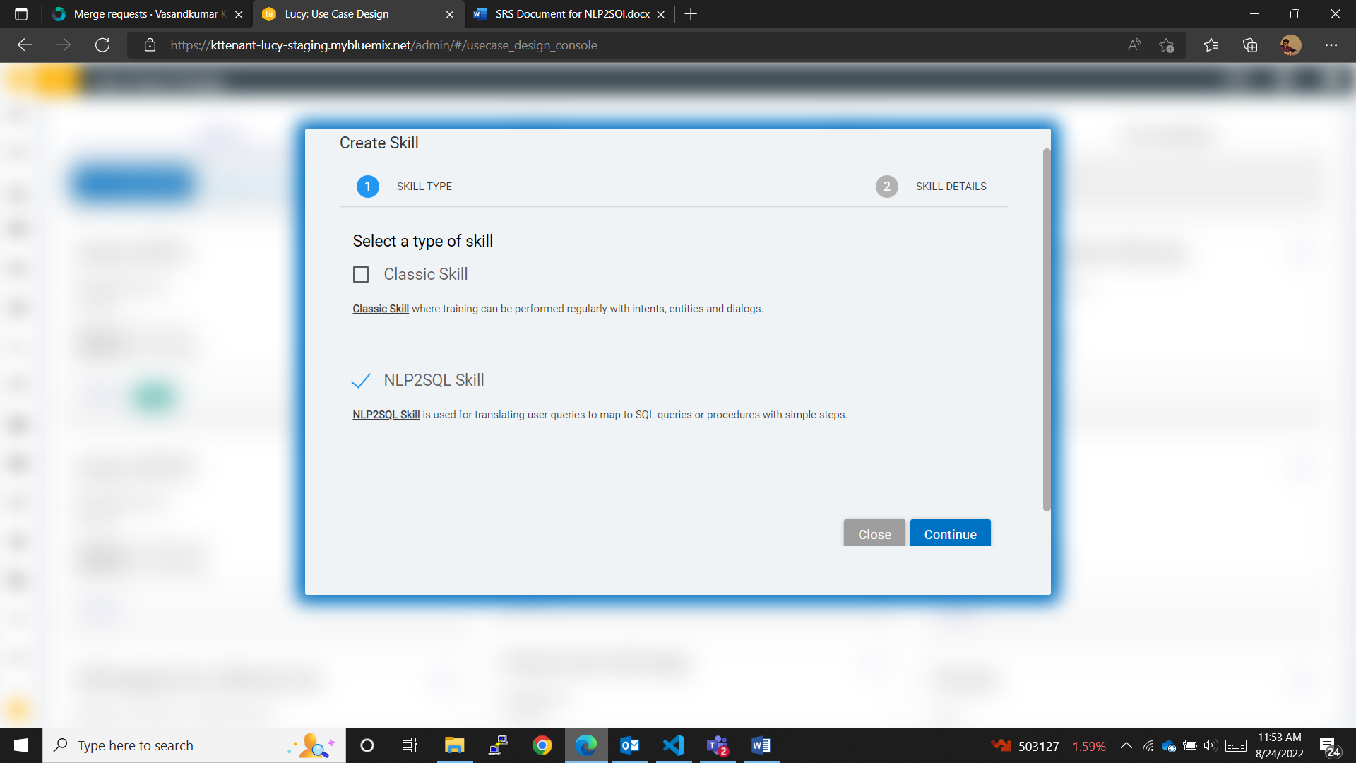 A pop-up window opens and the user is presented with two options: the NLP2SQL skill and the Regular skill.