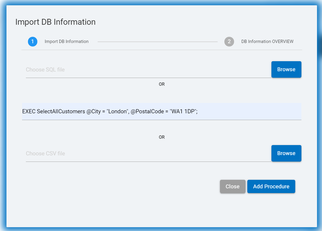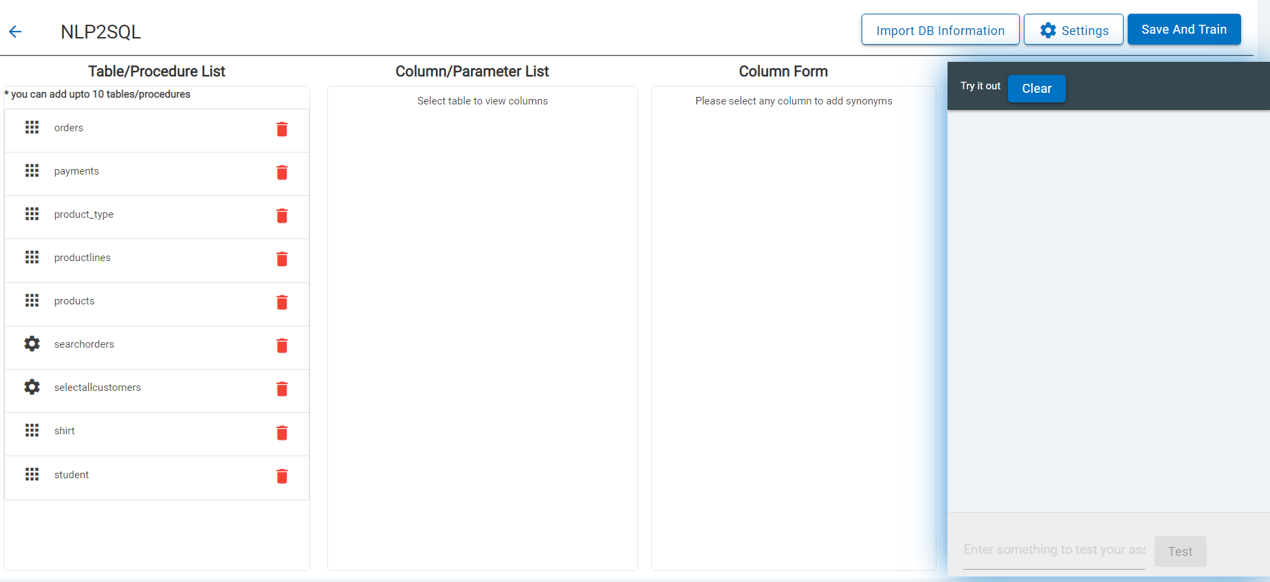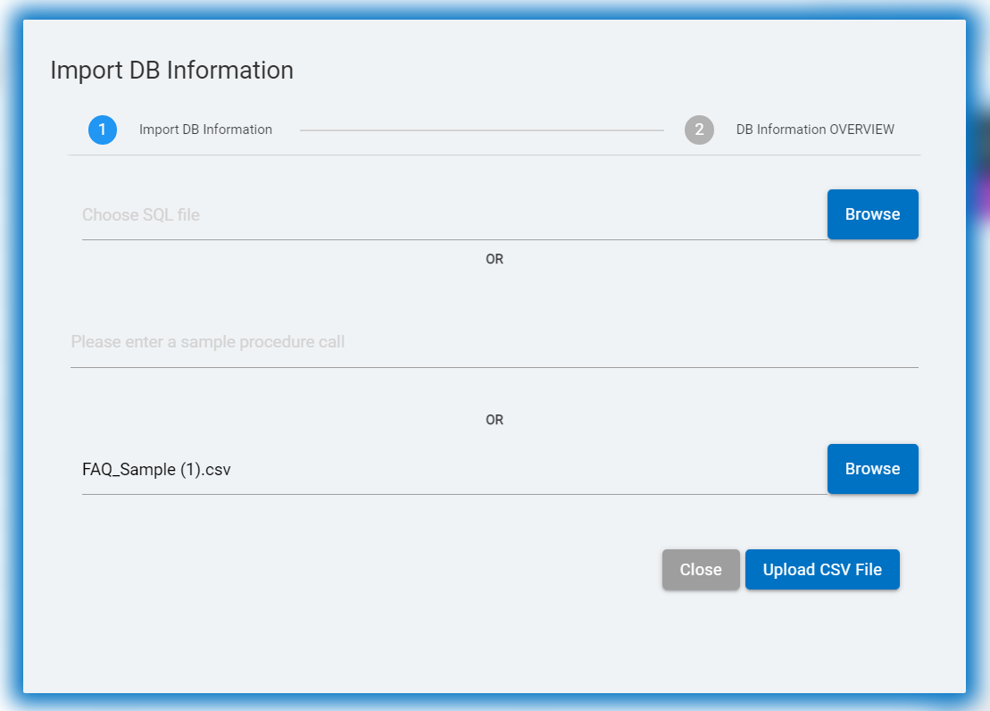 In the NLP2SQL console the user can import database information in form of .sql files or .csv files. They can also add stored procedures in here using sample procedure calls.