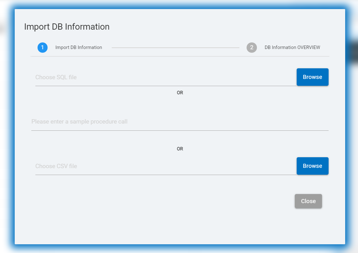 The console has a button for “Import DB Information” which allows the user to upload database information using SQL or CSV files. The user can also add stored procedures using this button.
