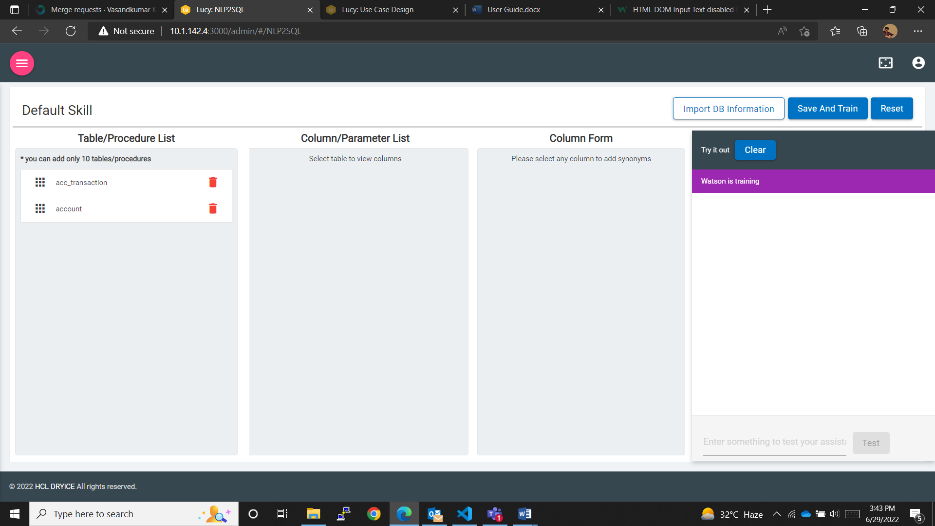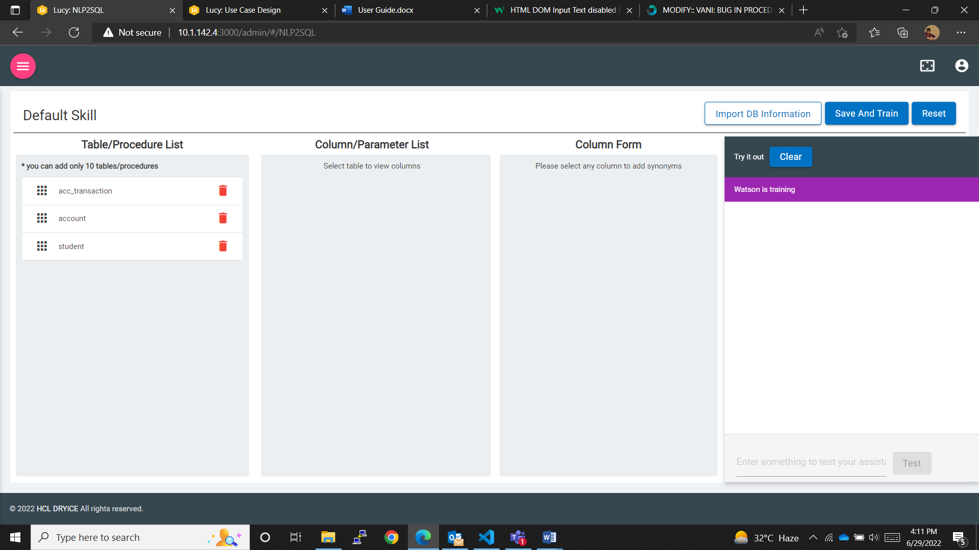 After importing the DB information the user has to use the “Save and Train” button to save and train the changes made to the skill. After the training is completed the user can use the “TRY IT” window to test the skill.