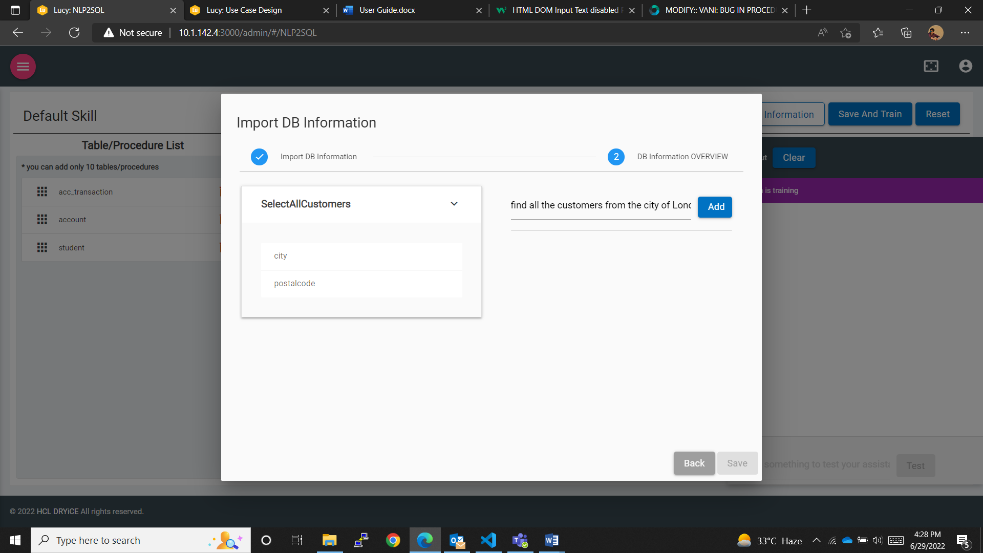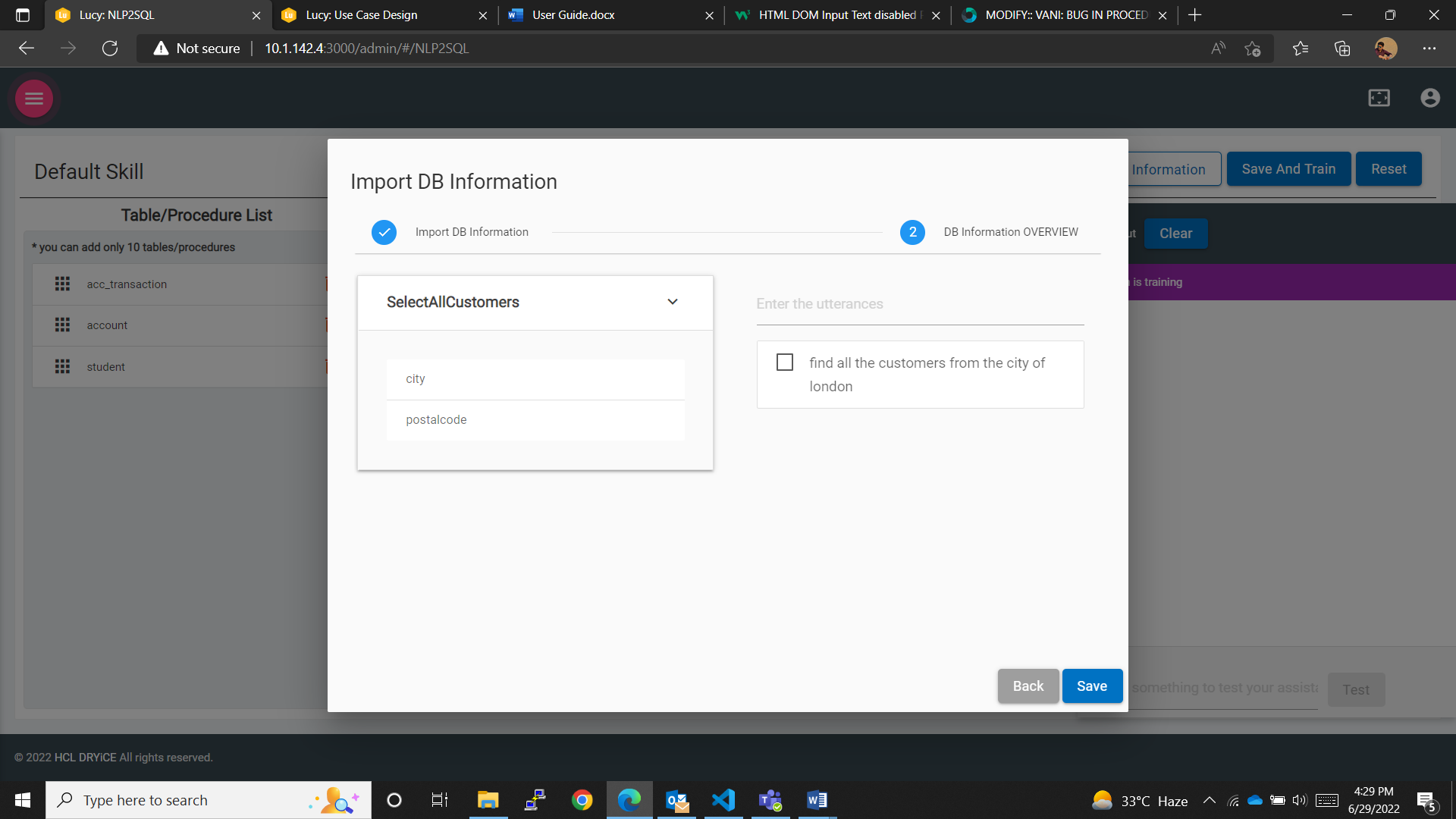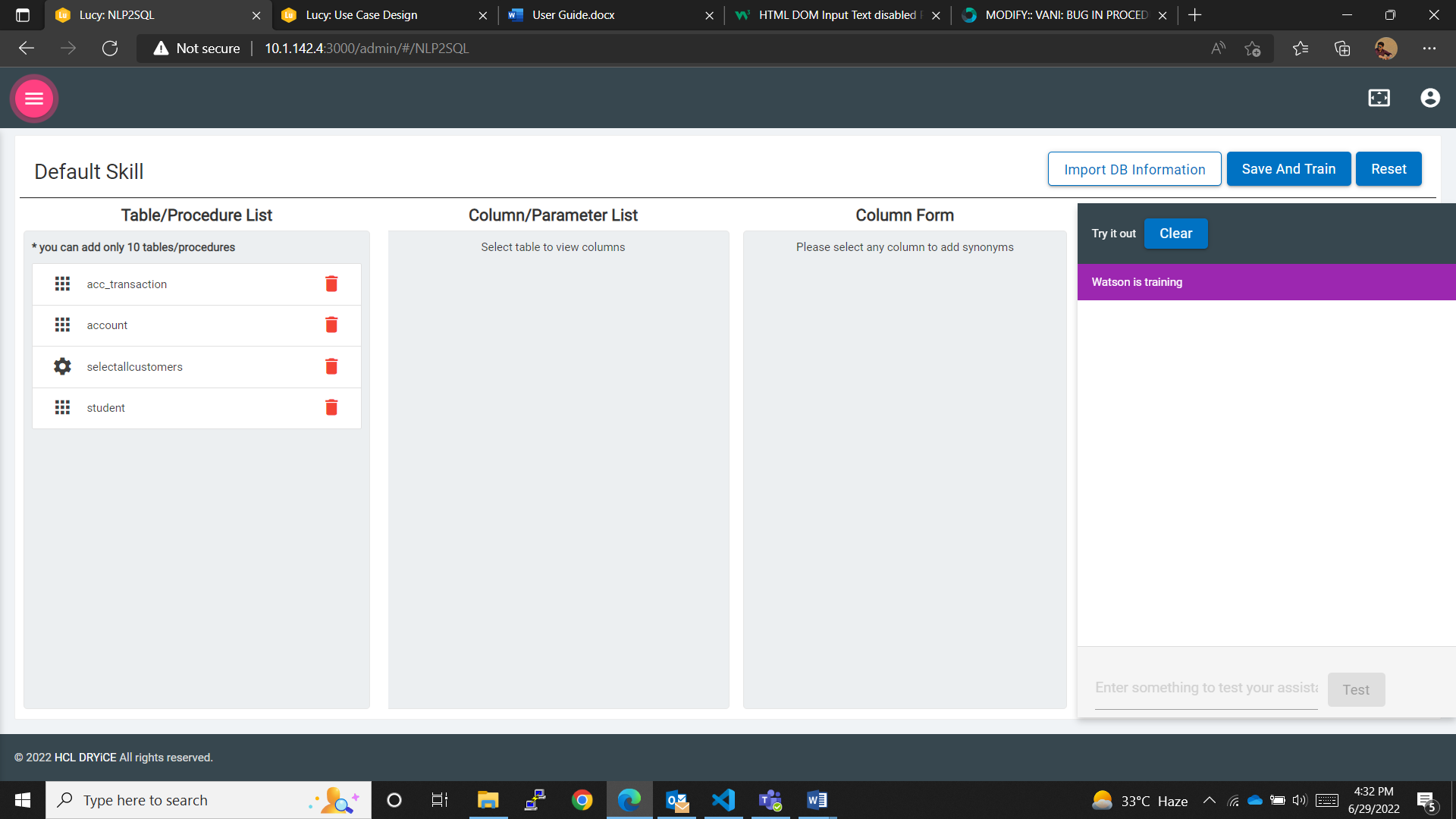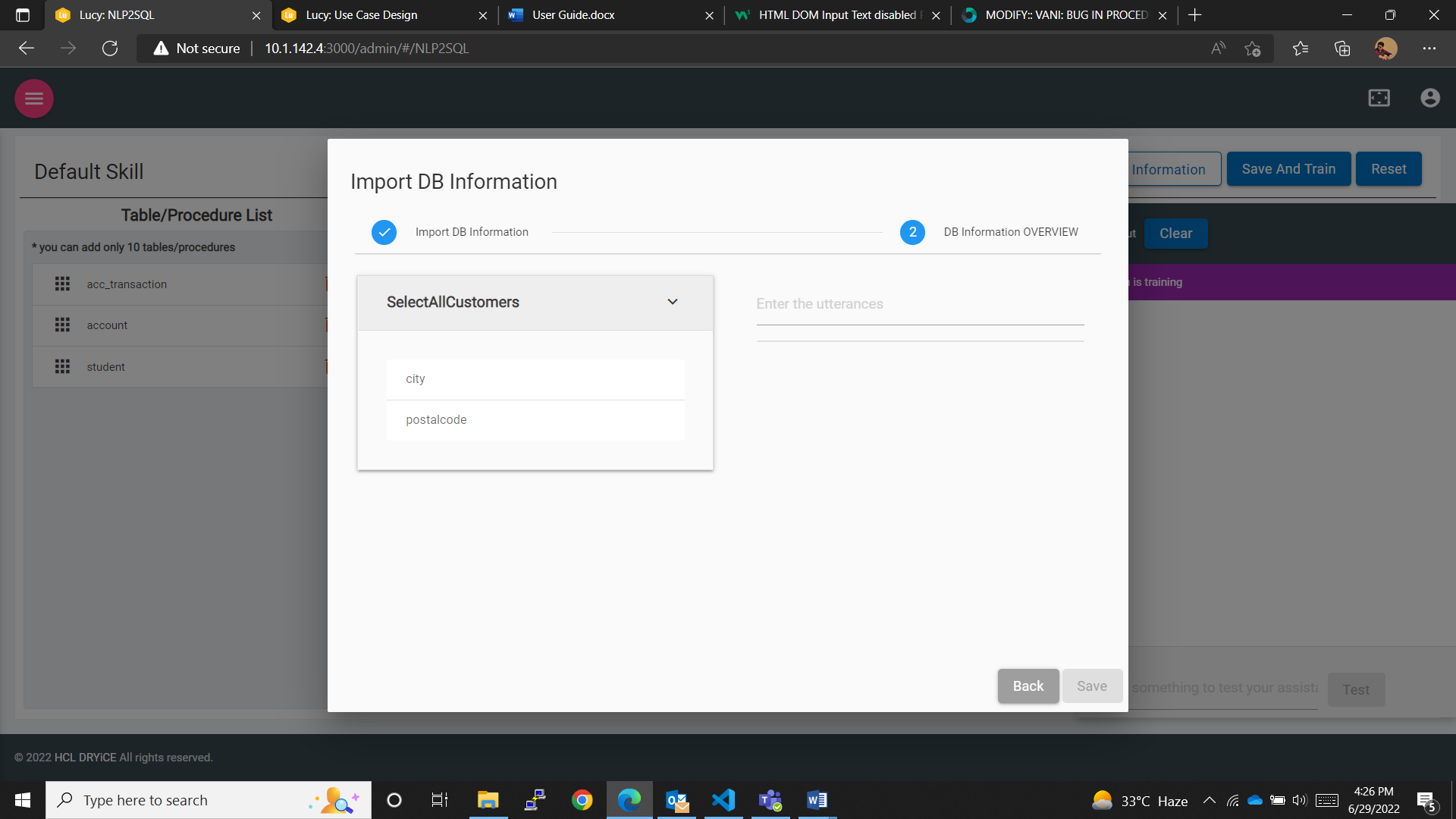 - Save And Train Button: To save the changes made, such as tables/procedures added, changes made to the datatype of the table columns, added utterances and variations or synonyms, values, etc., and to train the skill created initially by the user with the available database information.