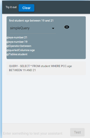 In the Try It Window, the user can try the queries to test the Usecase. The Usecase has to be trained using the “Save and Train” button before using the Try It Window to test the use case.